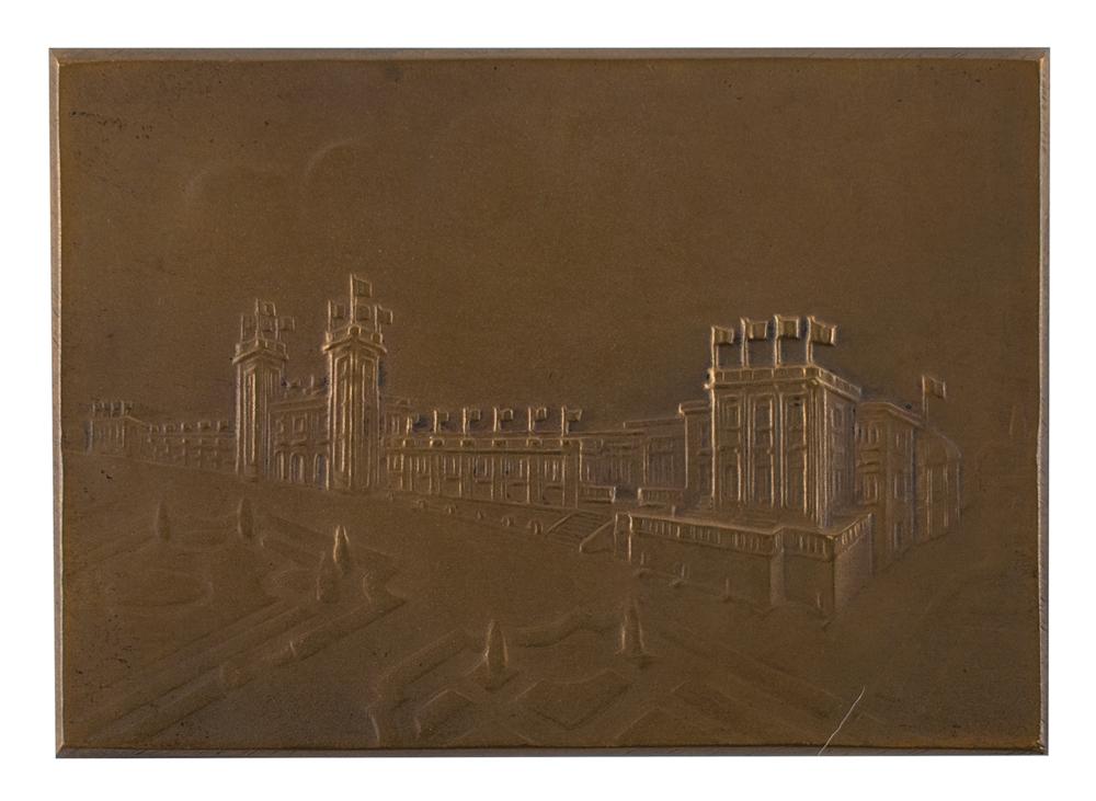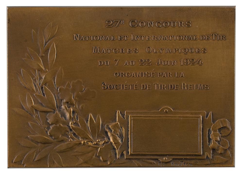 Uncommon plaquette issued for shooting matches at the Paris 1924 Summer Olympics. Bronze, 70 mm x 51 mm, 90 gm, by Heinrich Kautsch. The front depicts the Reims athletic site with shooting event buildings; the reverse features an empty tablet with laurel and oak branches and a six-line legend, (translated) “27 Competitions, National and International Shooting, Olympic Matches, from 7 to 22 June 1924, Organized by the Shooting Company of Reims.”