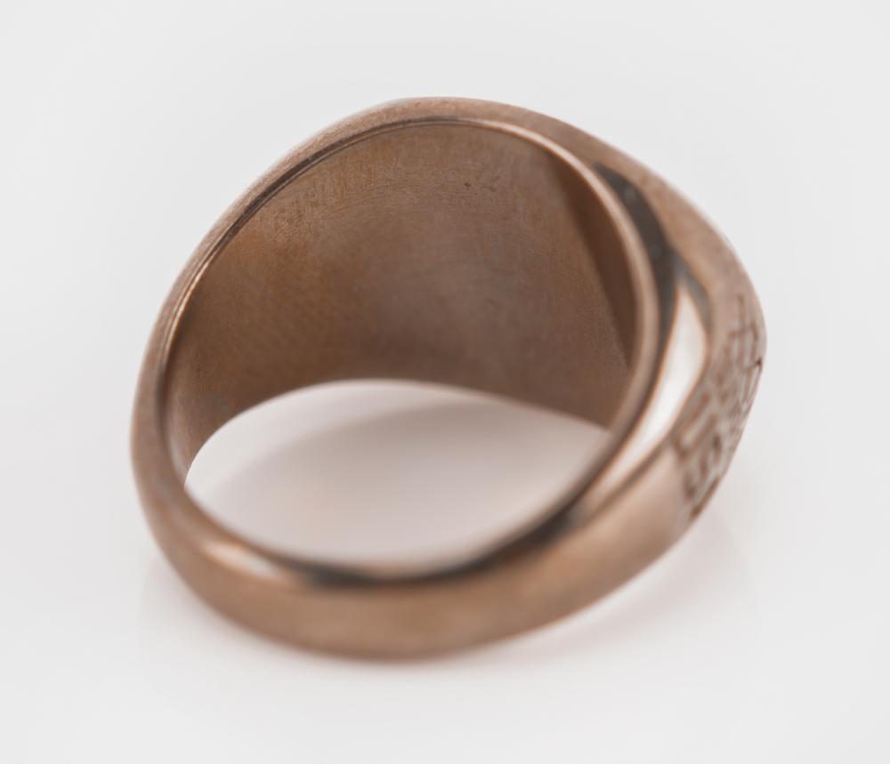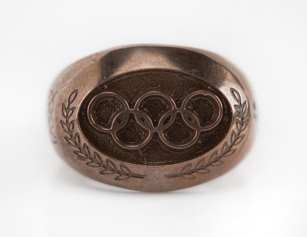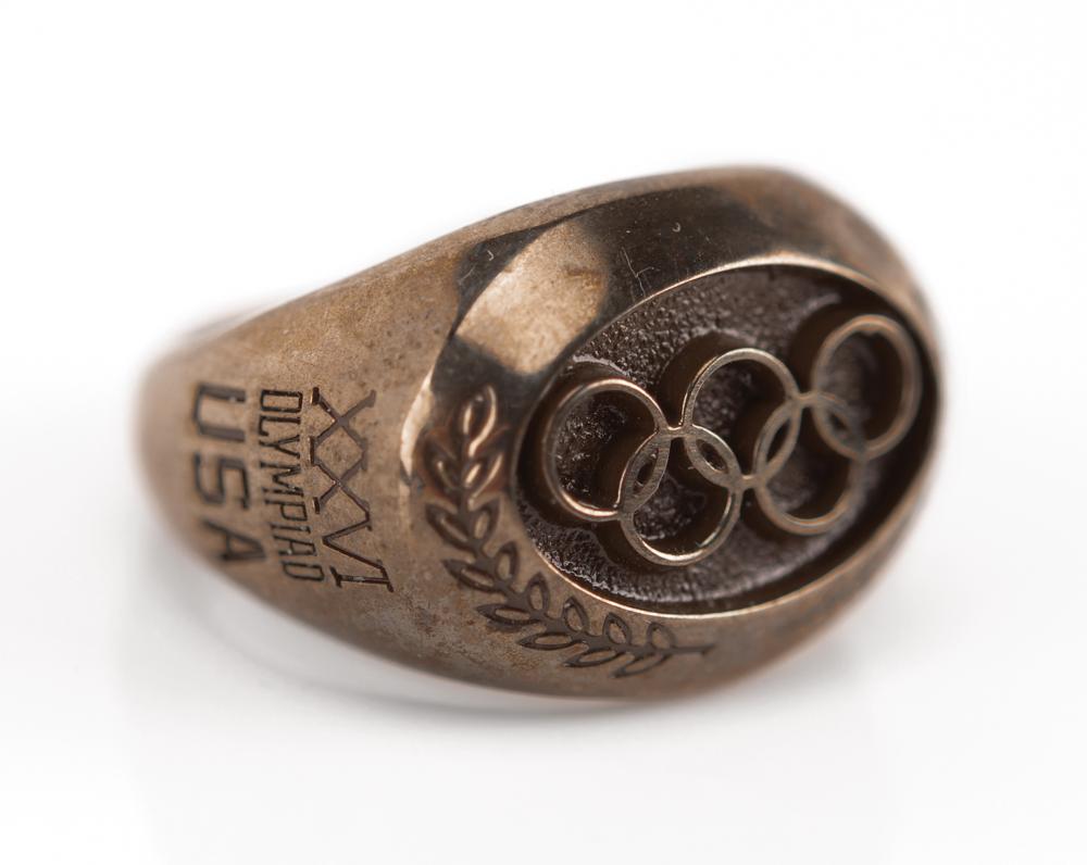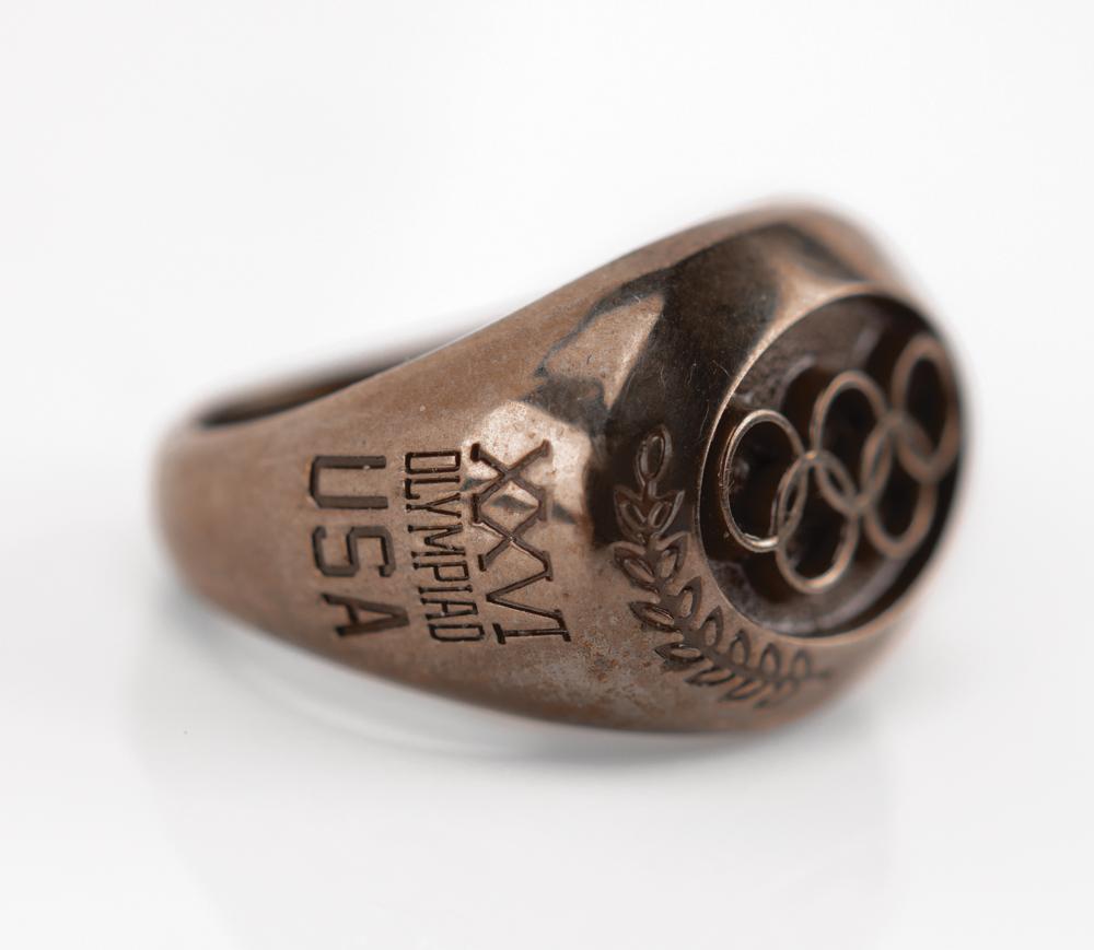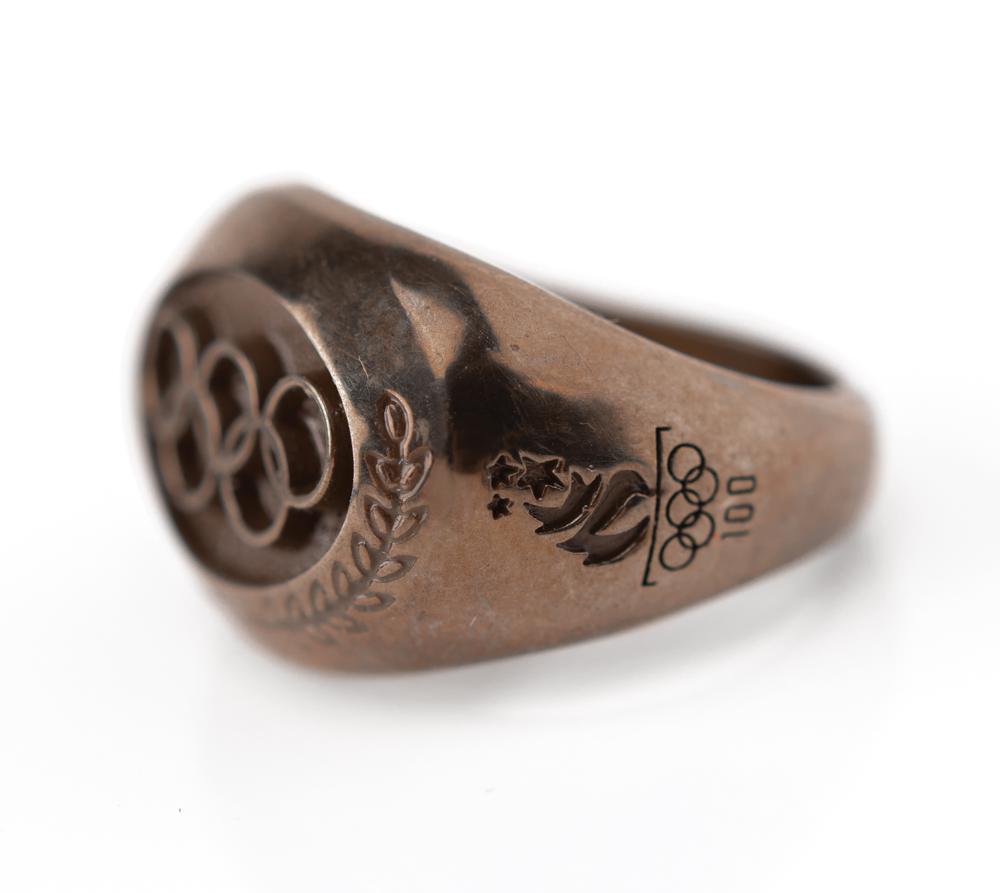 Uncommon official Atlanta 1996 Summer Olympics ring presented to members of the USA women’s team. The bronze-tone ring, size 6.75, features the Olympic rings above a laurel wreath to top, with one shank showing the logo of the Centennial Olympic Games, and the other side engraved: “XXVI, Olympiad, USA.” In fine condition.