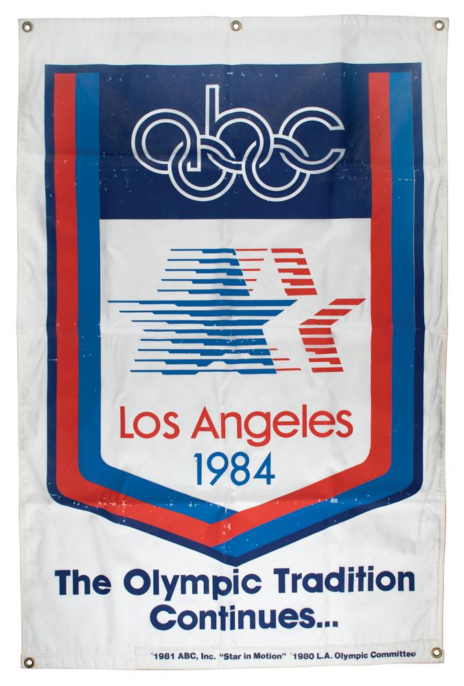 Original color 31″ x 47.5″ vinyl banner used by ABC Sports for broadcasts during the Los Angeles 1984 Summer Olympics, which prominently displays the LA Games logo below the ABC-Olympic rings, with text to bottom reading: “The Olympic Tradition Continues…” Lower portion bears an ABC and LA Olympic Committee ‘Star in Motion’ copyright caption. In fine, folded condition.
