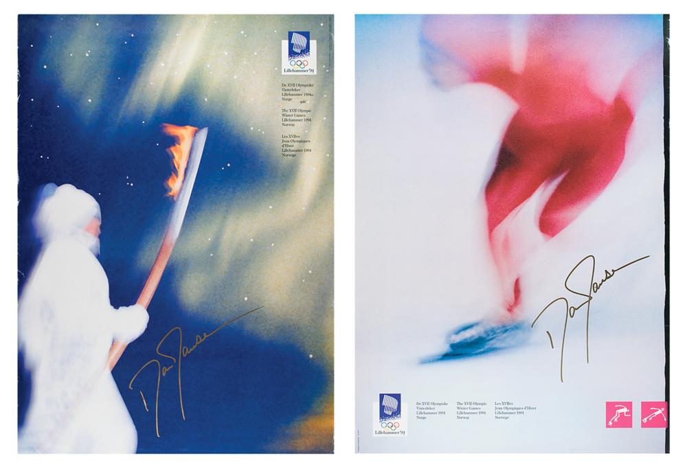 Pair of color 19.75″ x 27.5″ posters from the Lillehammer 1994 Winter Olympics, both signed in gold ink by American speed skater Dan Jansen, who at the 1994 Winter Games won a gold medal in his final race: the 1,000 meters. Both posters feature text in Norwegian, English, and French, “The XVII Olympic Winter Games, Lillehamer 1994, Norway,” with one depicting a relay runner with the Olympic torch, and other the blurred approach of a speed skater. Rolled and in overall fine condition, with some light edge wear, which includes a couple small tears.
