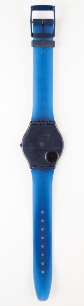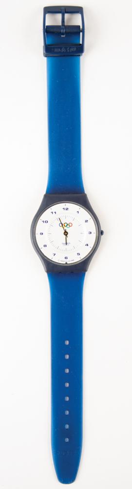 An Olympic Swatch Skin watch (AG 1996, V8), with blue rubber strap and matching case, and white Olympic rings against a white dial. In fine condition. Accompanied by the original case and instruction manual.