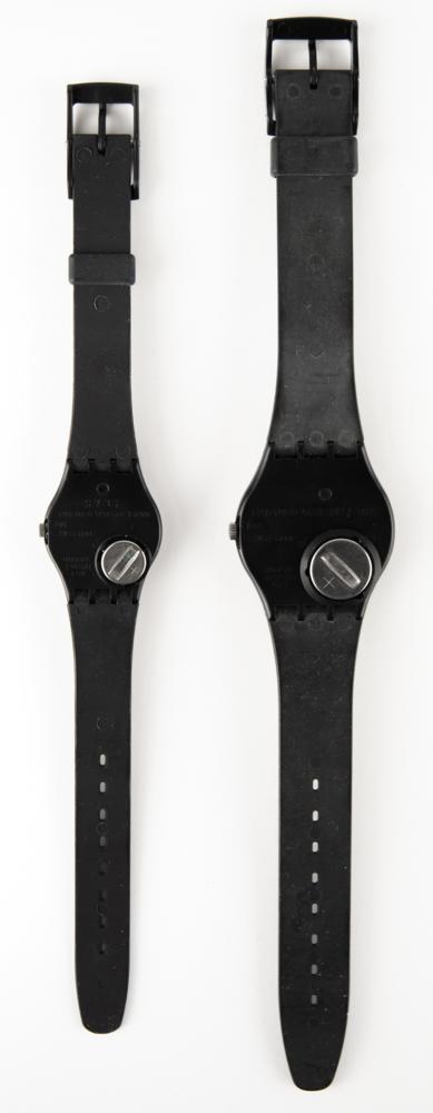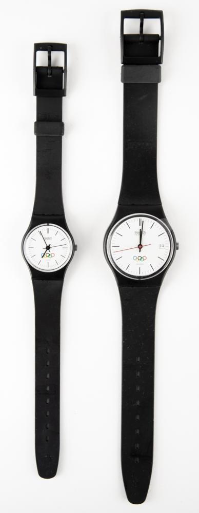 Pair of men’s and women’s Olympic watches made by Swatch. The men’s watch measures 9″ in length and the women’s watch measures 8″ in length, with both featuring white dials with Olympic rings. Both watches include their original plastic cases and instruction manuals. In overall fine condition.