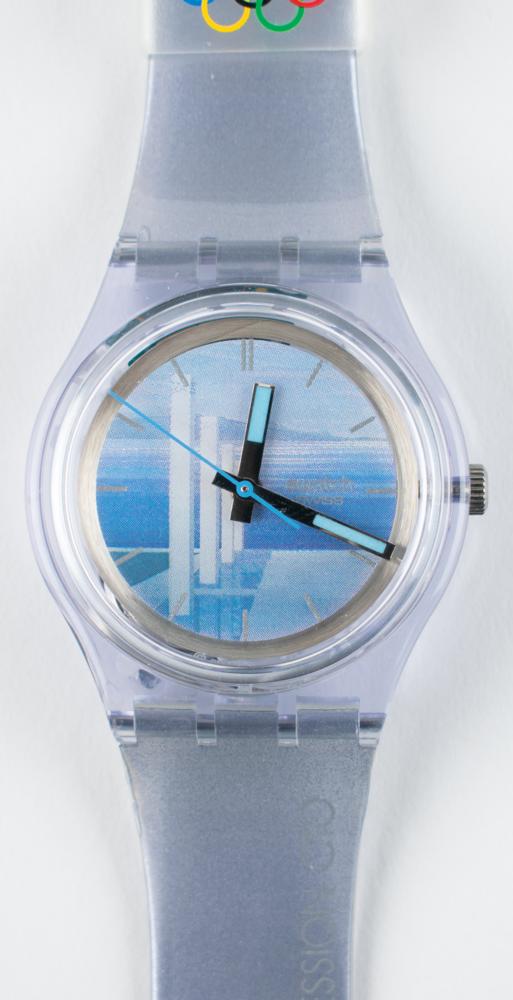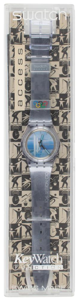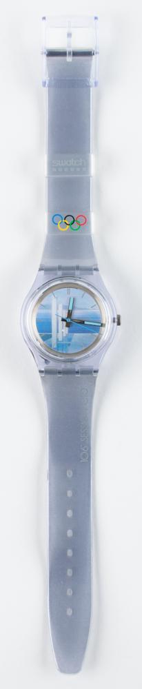 Swatch Access watch presented to members of the International Olympic Committee (IOC) at the 106th IOC meeting held in Lausanne, Switzerland in 1997, limited edition of 200 issued. The watch measures 9″ in length, with the rubber strap marked “106 Session CIO,” and the strap holder featuring the Olympic rings. Includes the original case and instruction manuals. In fine condition. These watches were given specially to IOC members and were never made available to the public.