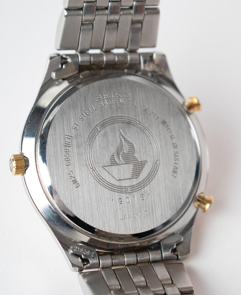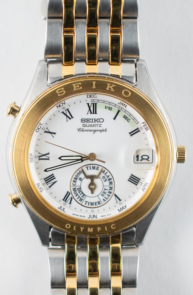 Attractive circa 1992 Olympic chronograph watch by Seiko (190151). The stainless steel two-tone watch features a golden bezel marked “Seiko, Olympic,” and the backplate bears an engraved Olympic torch and is numbered “6M25-6050 (R1).” In fine condition.