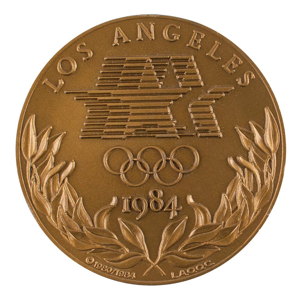 Participation medal issued for the Los Angeles 1984 Summer Olympics, as presented to athletes and officials. Bronze, 60 mm, 94 gm, by Dugald Stermer/Jostens. The front depicts the Olympic torch with raised text, “Citius Altius Fortius, XXIII Olympiad”; the reverse features the Los Angeles Games emblem over Olympic rings and laurel branches. Complete with its original blue velvet presentation case, which bears some light marks.