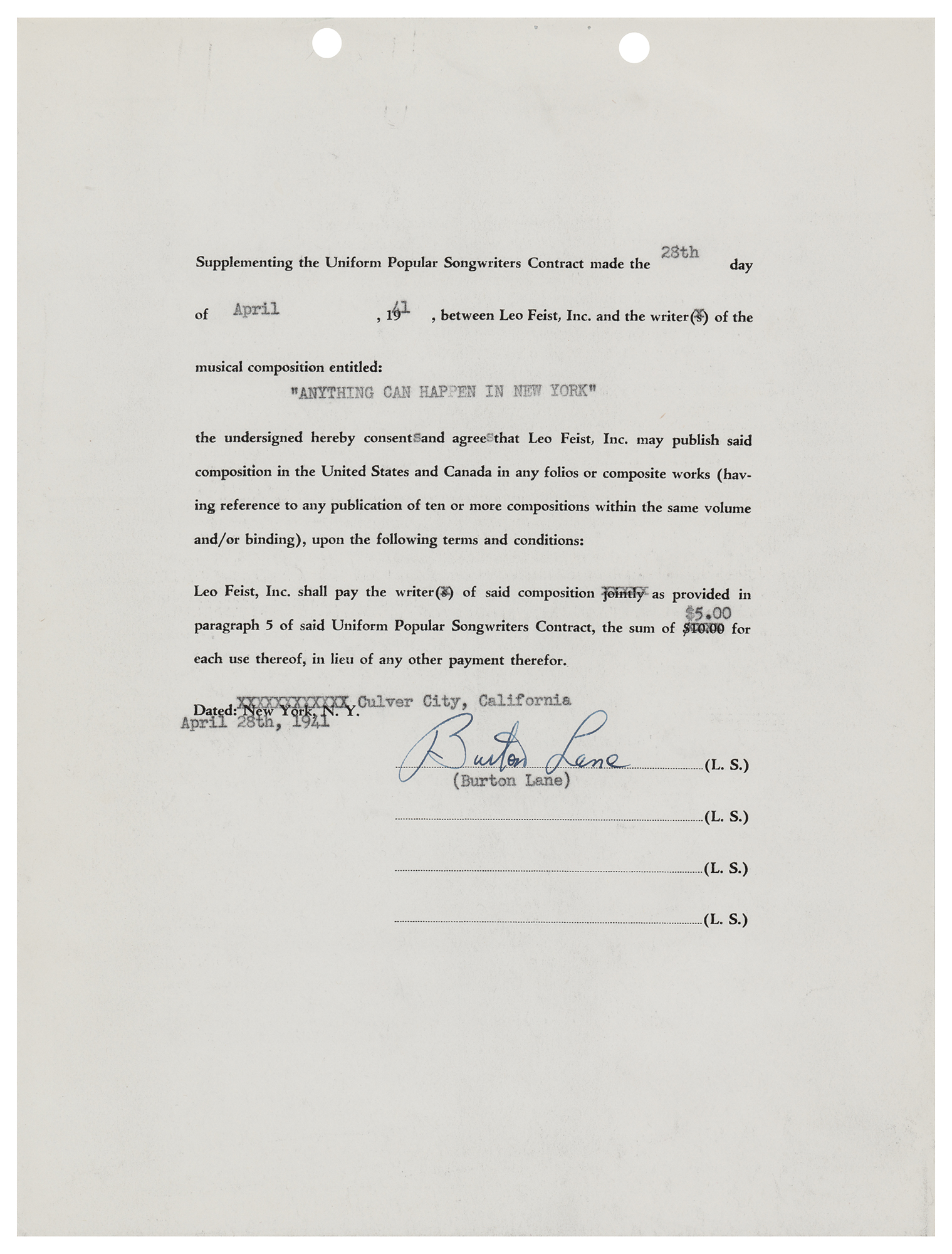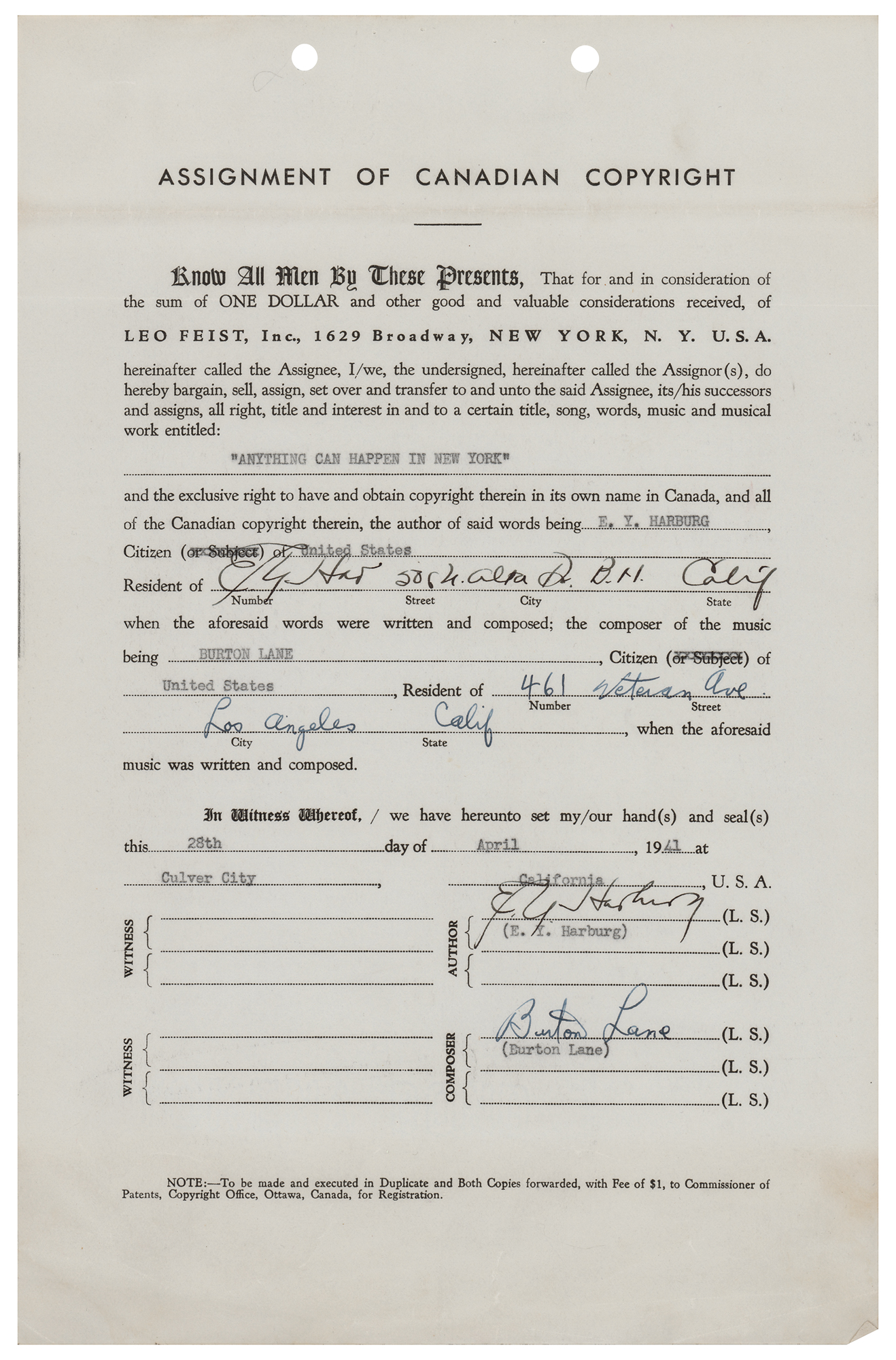 DS, two pages, 8.5 x 13, April 28, 1941. Assignment of Canadian copyright document by which Harburg and Lane assign the rights to 'Anything Can Happen in New York' to music publisher Leo Feist, Inc. In the body of the document, Harburg writes his address, "E. Y. Har, 5064 Alta Dr. B. H. Calif," and Lane follows suit writing, "461 Western Ave, Los Angeles, Calif." Both sign in fountain pen at the conclusion of the first page, and Lane signs again on the second. In fine condition, with light creasing to the bottom.
