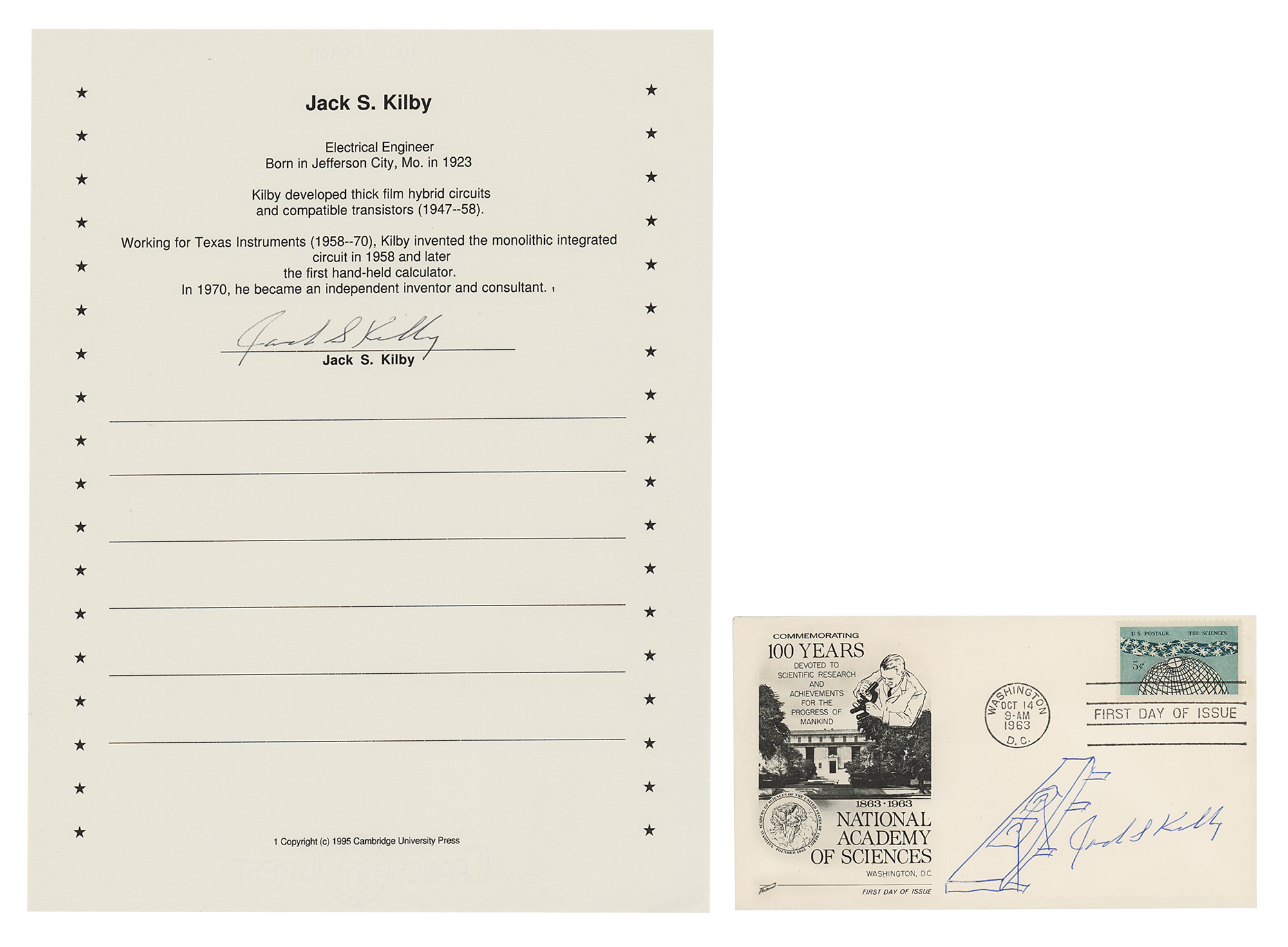 Physicist (1923-2005) who won the Nobel Prize in 2000 for his 1958 invention of the integrated circuit. Two items: an original ballpoint sketch of an integrated circuit on an FDC honoring the National Academy of Sciences, signed in blue ballpoint, "Jack S. Kilby"; and an 8.5 x 11 biographical sheet, signed in black ballpoint, "Jack S. Kilby." In fine condition.