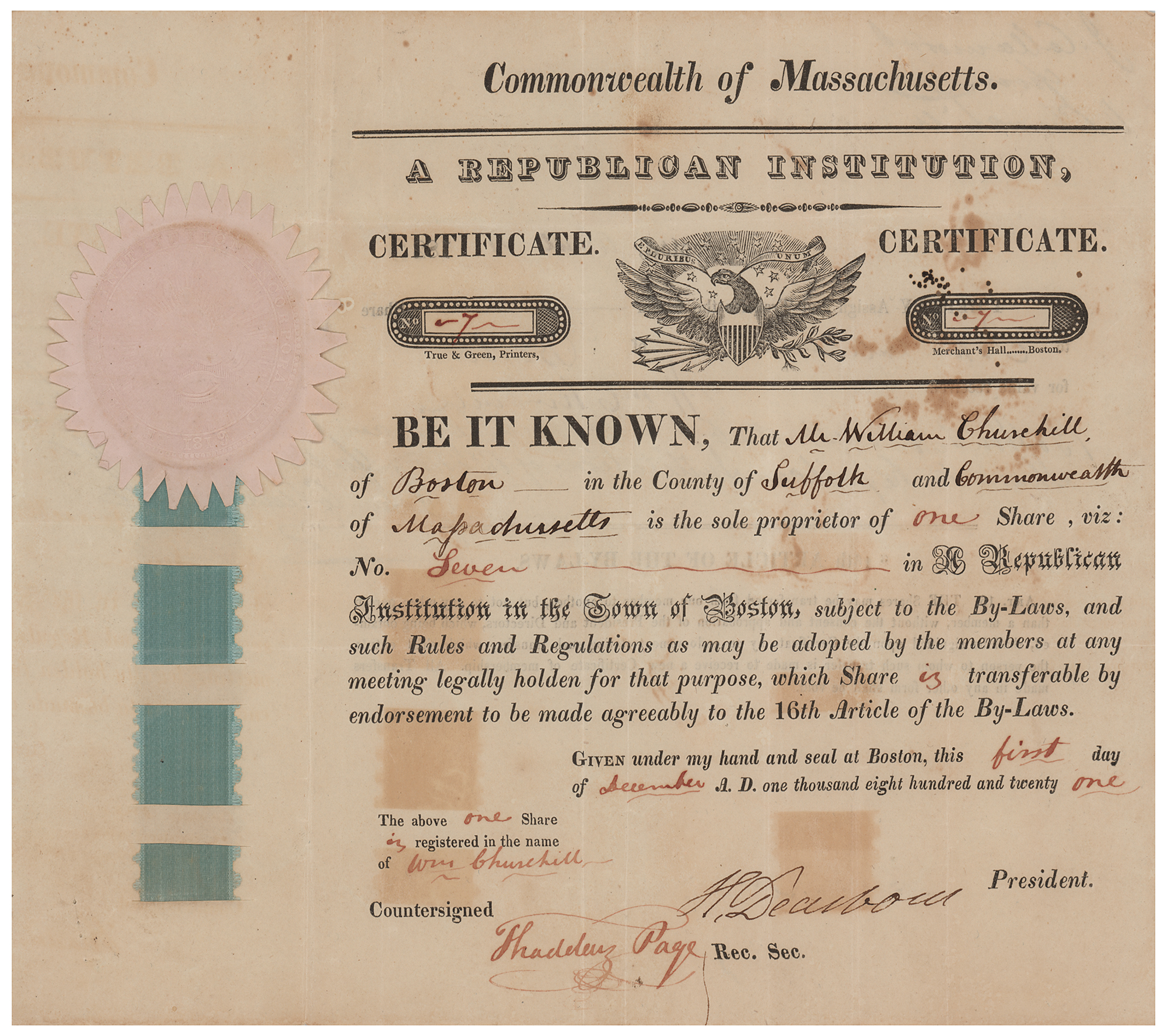 General during the Revolutionary War and the War of 1812 (1751-1829) who served as secretary of war under Thomas Jefferson. Partly-printed DS, signed “H. Dearborn,” one page, 10 x 8, December 1, 1821. Certificate issued to William Churchill for one share in "A Republican Institution in the Town of Boston." Signed at the conclusion by Dearborn as president of the organization, and countersigned by Thaddeus Page, a Massachusetts political figure and veteran of the War of 1812. The white paper seal and light blue ribbon affixed to the left side remain intact. In very good to fine condition, with scattered staining, and ribbon-related toning.