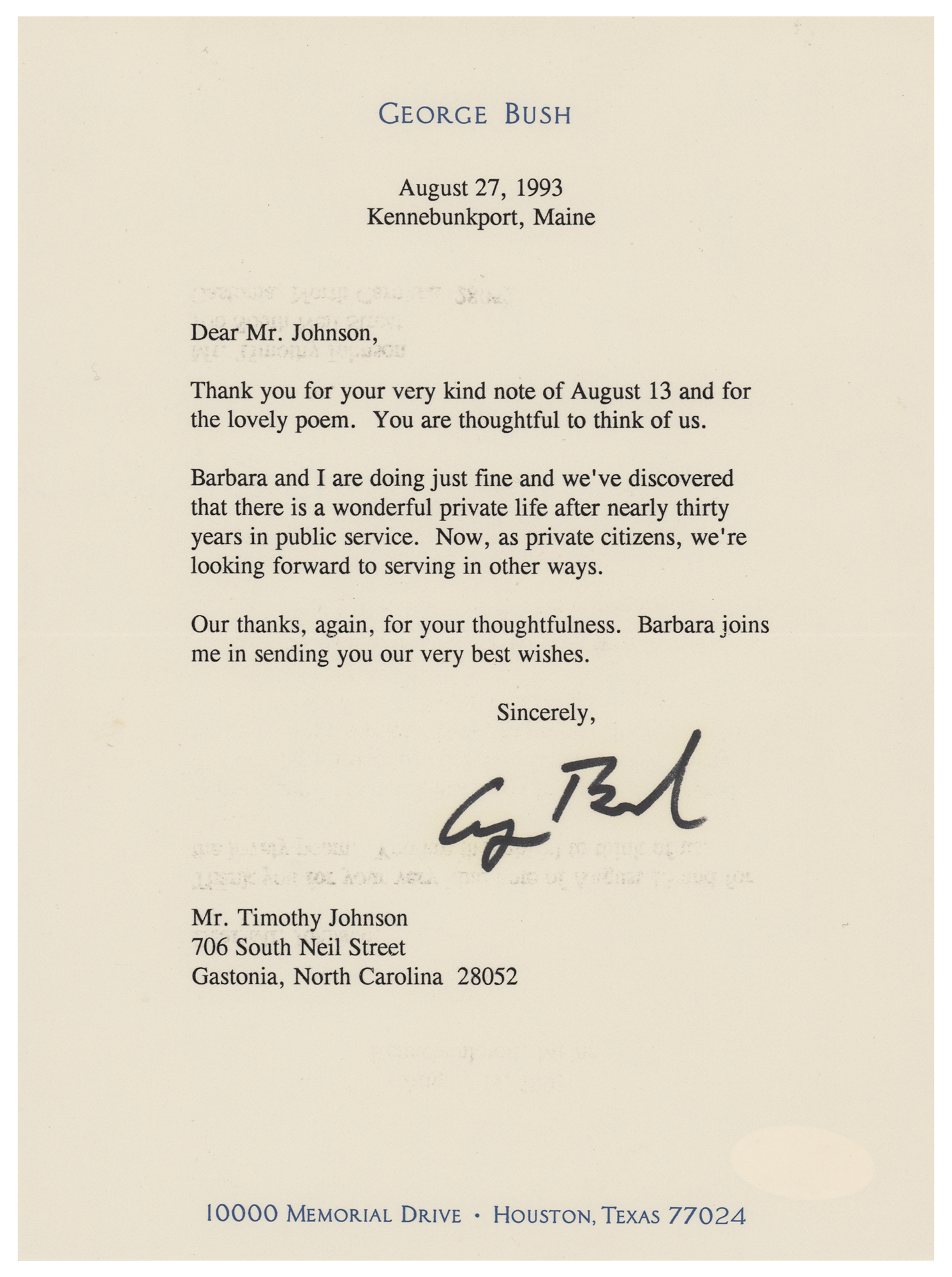 TLS, one page, 6.25 x 8.5, personal letterhead, August 27, 1993. Letter to Timothy Johnson, in part: "Barbara and I are doing just fine and we've discovered that there is a wonderful private life after nearly thirty years in public service. Now, as private citizens, we're looking forward to serving in other ways." In fine condition, with light show-through from a JSA sticker on the reverse. Accompanied by a certificate of authenticity from JSA.