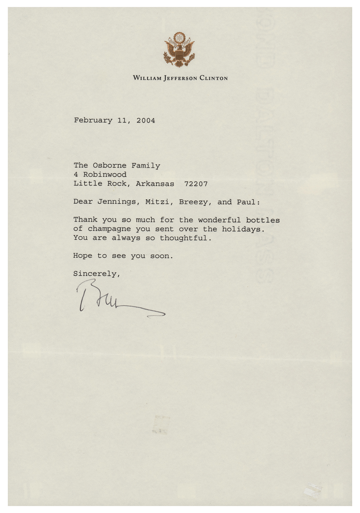 TLS signed “Bill,” one page, 7.25 x 10.5, personal letterhead, February 11, 2004. Letter to the Osborne family in Little Rock, in part: "Thank you so much for the wonderful bottles of champagne you sent over the holidays. You are always so thoughtful." In fine condition, with several small pieces of adhesive on the back (and one piece at lower right corner), resulting in some show-through. Accompanied by the original mailing envelope bearing a pre-printed free frank.
