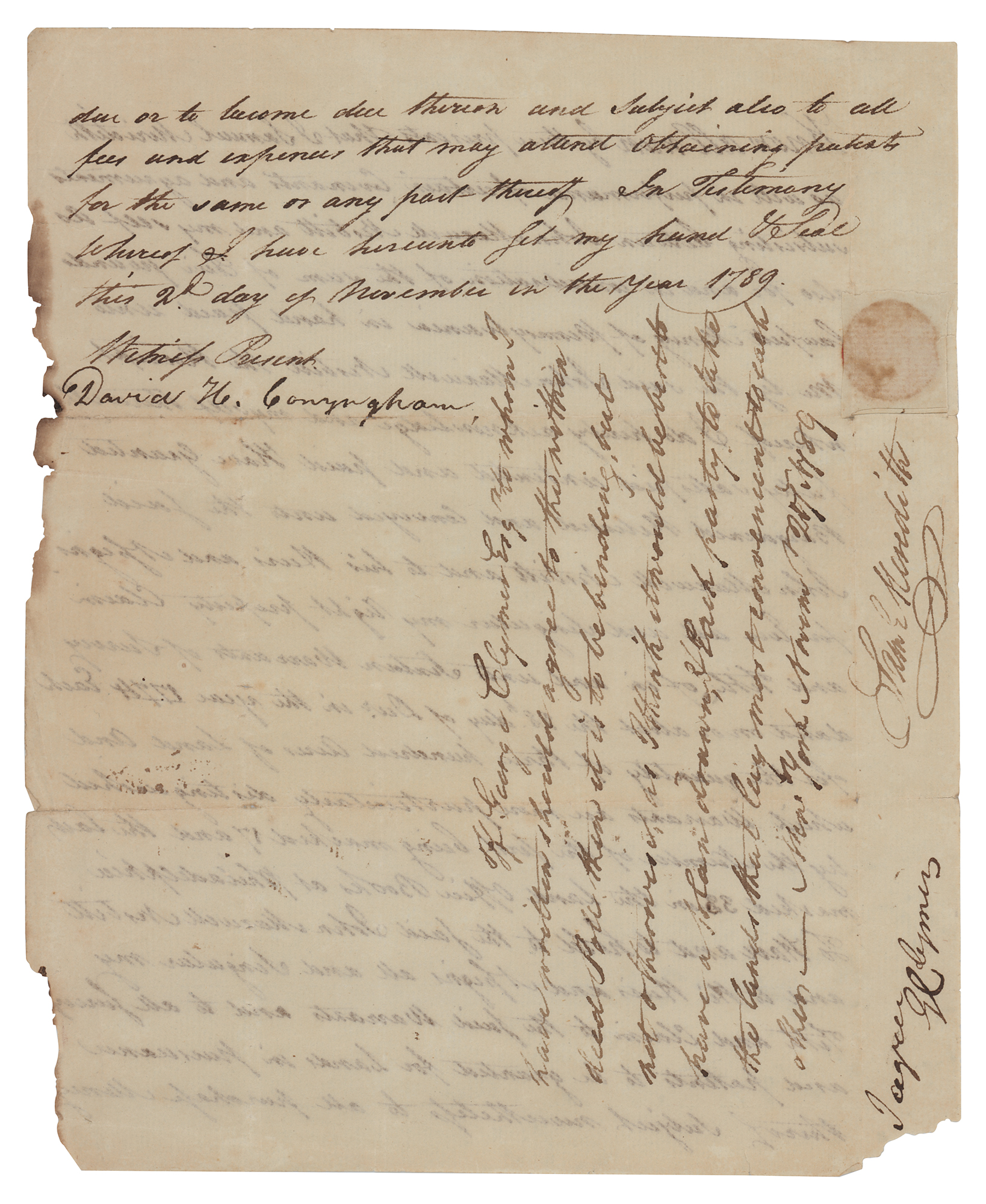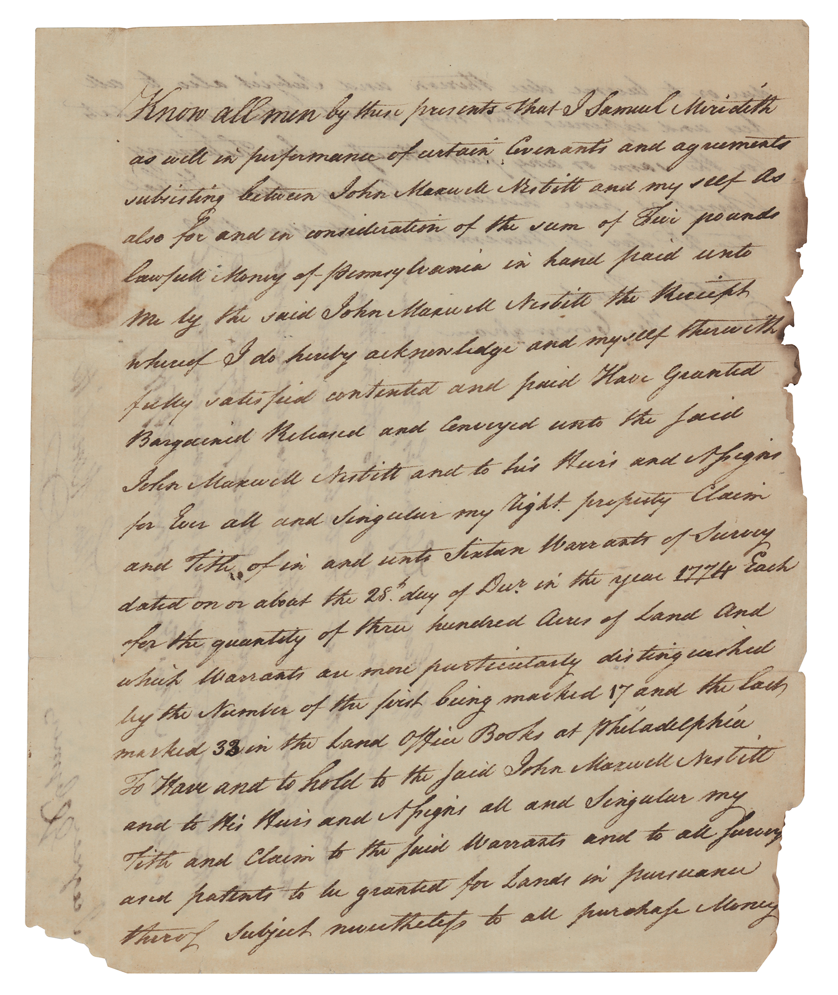 Signer of the Declaration of Independence from Pennsylvania (1739-1813) who served as the first president of the Philadelphia Bank. Manuscript DS, signed “I agree, G. Clymer,” one page both sides, 7.25 x 9, November 2, 1789. Document concerning a real estate transaction, in part: "Know all men by these presents that I Samuel Meridith as well in performance of certain covenants and agreements subsisting between John Maxwell Nesbitt and myself as also for and in consideration of the sum of Five pounds lawfull money of Pennsylvania?I do hereby acknowledge and myself therewith fully satisfied contended and paid Have granted?sixteen warrants of survey?for the quantity of three hundred acres of Land." A manuscript endorsement has been written vertically at the conclusion, signed by Samuel Meredith, in part: "If George Clymer Esq., to whom I have written should agree to the within deed poll then it is to be binding, but not otherwise, as I think it would be best to have a plan drawn & each party to take the lands that lay most convenient to each other." Endorsed below by Clymer to approve of the agreement. In very good condition, with some edge and corner paper loss, and partial splits to folds.