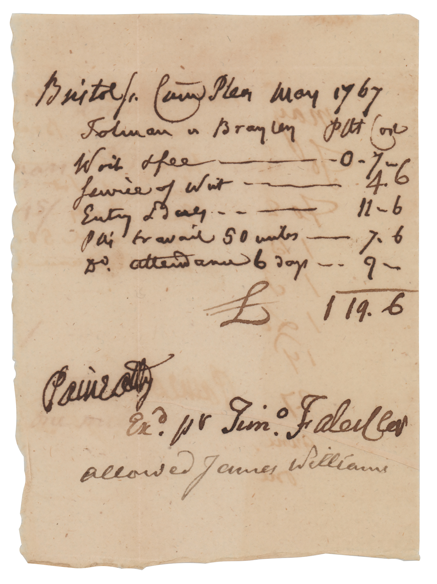 Massachusetts lawyer (1731-1814) who served as one of the prosecutors of British soldiers during the Boston Massacre trial; he later signed the Declaration of Independence. ADS, signed "Paine Atty," one page, 3 x 4.25, May 1767. Handwritten bill for his legal services in the amount of £1.19.6, including charges for "writ & fee," "service of writ," "entry & dues," and "attendance 6 days." In fine condition.