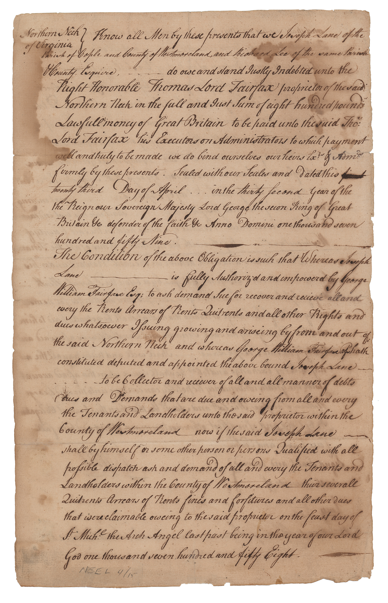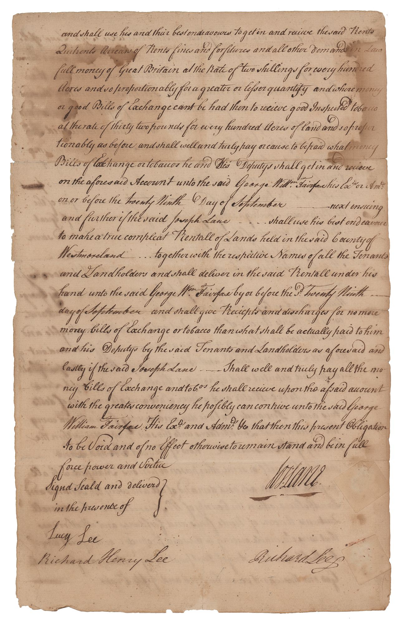 Member of the notable Lee family and signer of the Declaration of Independence from Virginia (1732-1794). Scarce manuscript DS, one page both sides, 8 x 13, 1758. Legal document for a real estate transaction, in part: "Joseph Lane…and Richard Lee of the same Parish…do owe & stand Justly Indebted unto the Right Honorable Thomas Lord Fairfax proprietor of the said Northern Neck in the full and Just Sum of eight hundred pounds Lawfull money of Great Britain to be paid unto the said Thos. Lord Fairfax…to be collector and receiver of all and all manner of debts, dues and demands that are due and oweing from all and every the Tenants and Landholders unto said proprietor within the County of Westmoreland." Signed at the conclusion by Richard Henry Lee, along with Lucy Lee, Richard Lee, and Joseph Lane, who served in the General Assembly and was a lieutenant colonel in the Whiskey Rebellion of 1793. In very good to fine condition, with dampstaining to the top.