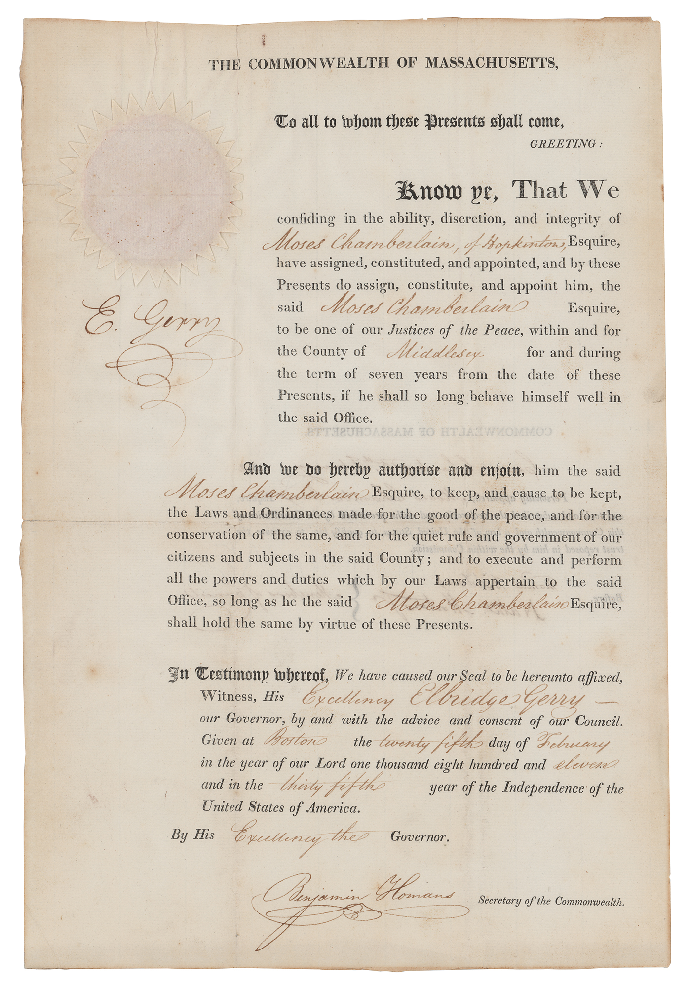 Signer of the Declaration of Independence from Massachusetts (1744-1814) who later served as vice president under James Madison. His name entered the language as a result of his support of politically advantageous redistricting, which became known as 'gerrymandering.' Partly-printed DS, signed “E. Gerry,” one page both sides, 9.25 x 13.5, February 25, 1811. As governor of Massachusetts, Gerry appoints Moses Chamberlain "to be one of our Justices of the Peace." Signed in the upper left in ink by Governor Gerry, and countersigned at the conclusion by Secretary of the Commonwealth Benjamin Homans. The white paper seal affixed to the upper left remains fully intact. In very good to fine condition, with partial separation to its central horizontal fold.