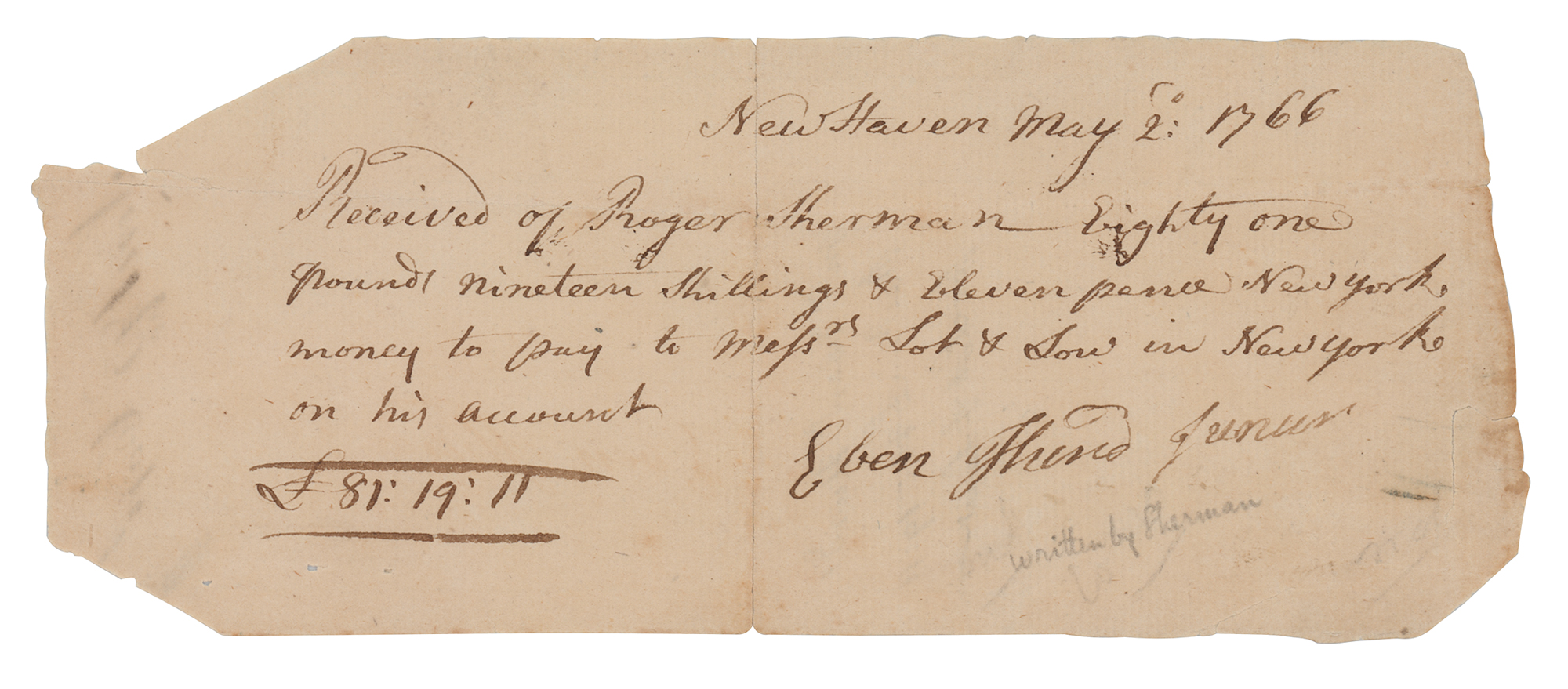 Signer of the Declaration of Independence from Connecticut (1721-1793) who was the only man to also sign the Articles of Association, the Articles of Confederation, and the US Constitution. Third-person ADS, one page, 7.25 x 3, May 2, 1766. Handwritten receipt by Sherman, incorporating his signature within the text. In full: "Received of Roger Sherman Eighty one pounds nineteen shillings & eleven pence New York money to pay Mess'rs Lot & Low in New York on his account." Signed at the conclusion by Ebenezer Hurd. In very good to fine condition, with a central vertical fold, and paper loss to the corners.
