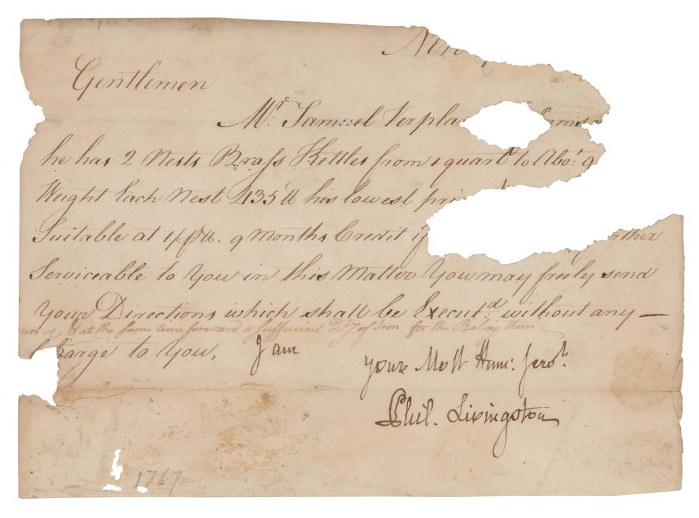 Signer of the Declaration of Independence from New York (1716-1778). LS signed “I am your Most Hum: Serv't, Phil. Livingston,” one page, 7.5 x 5.25, annotated in pencil with the date of 1767. Partial letter concerning "2 Nests Brass Kettles," signed at the conclusion by Livingston. In very good condition, with light staining, and areas of paper loss affecting the text, but not the signature. Accompanied by an engraved portrait bearing a facsimile signature.
