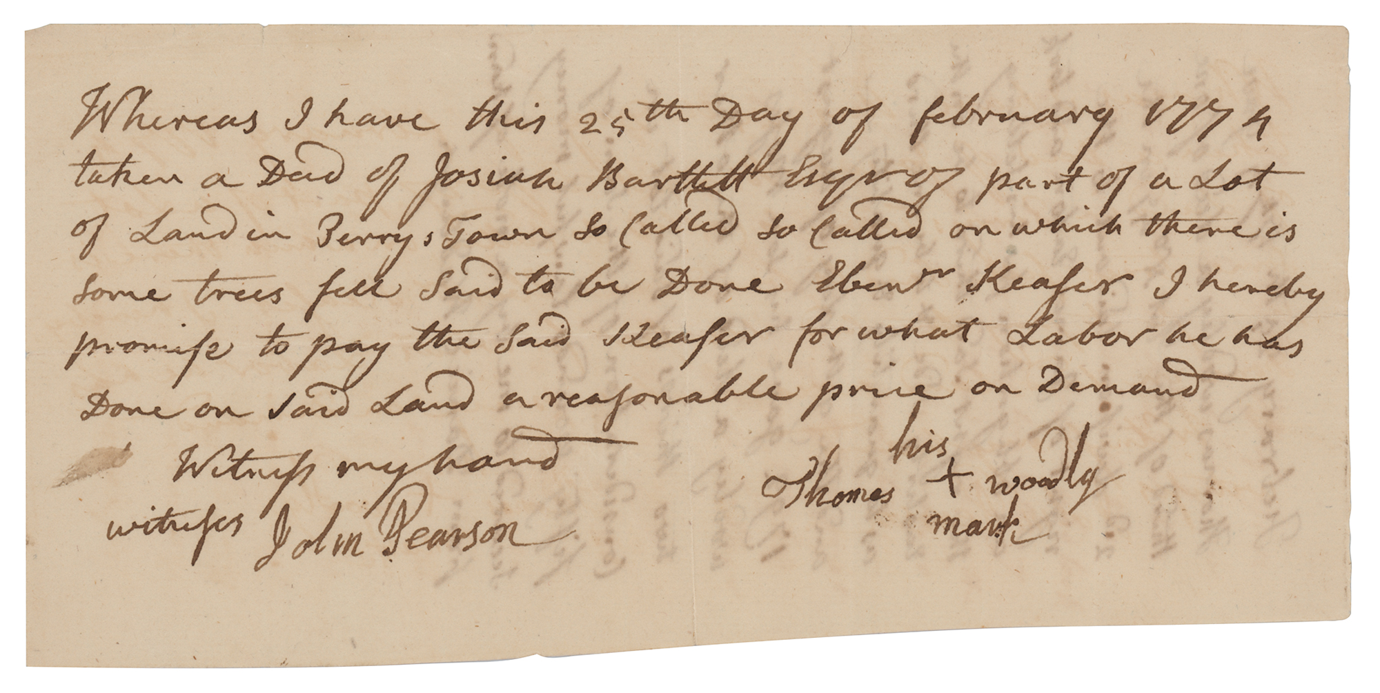 Physician and signer of the Declaration of Independence from New Hampshire (1729-1795) who served as that state's governor from 1790 to 1794. Third-person ADS, one page, 7.25 x 3.5, February 25, 1774. Handwritten legal document by Bartlett, incorporating his name within the text. In part: "Whereas I have?taken a deed of Josiah Bartlett Esqr. of part of a lot of land in Perry's Town?on which there is some trees fell said to be done Eben'r Keaser I hereby promise to pay the said Keaser for what Labor he has done on said land." Signed at the conclusion by Thomas Woodly with his mark, and countersigned by John Pearson as a witness. On the reverse is a manuscript notice concerning the deed and transaction. In fine condition.