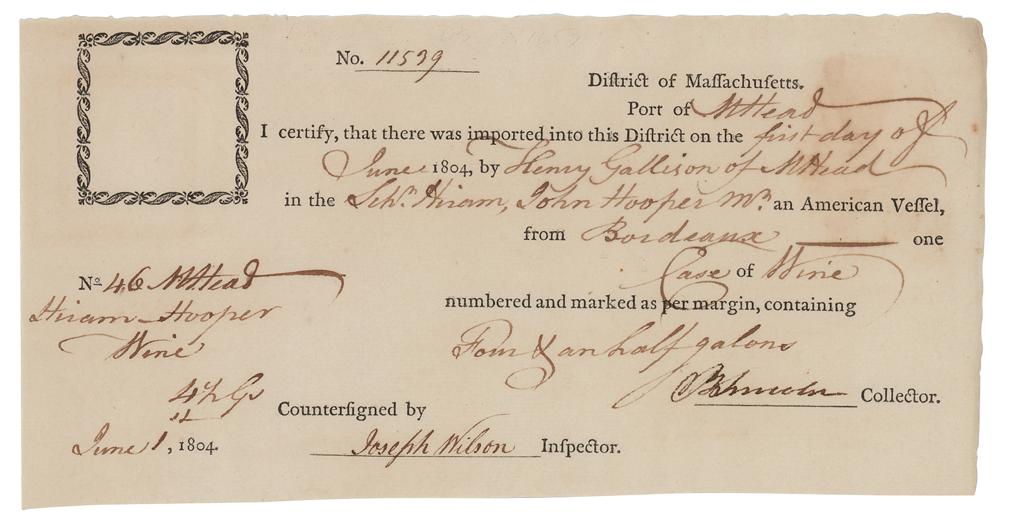 Partly-printed DS, signed “B. Lincoln,” one page, 9.25 x 4.75, June 1, 1804. As collector of the Port of Marblehead, Lincoln certifies an import of “one Case of Wine numbered and marked as per margin, containing Four & an half galons," delivered by Henry Gallison of Marblehead "in the Sch'r Hiram, John Hooper, M'r, an American Vessel, from Bordeaux." Signed at the conclusion by Lincoln as collector, and countersigned by Joseph Wilson as inspector. In fine condition. Accompanied by an engraving bearing facsimile signature.