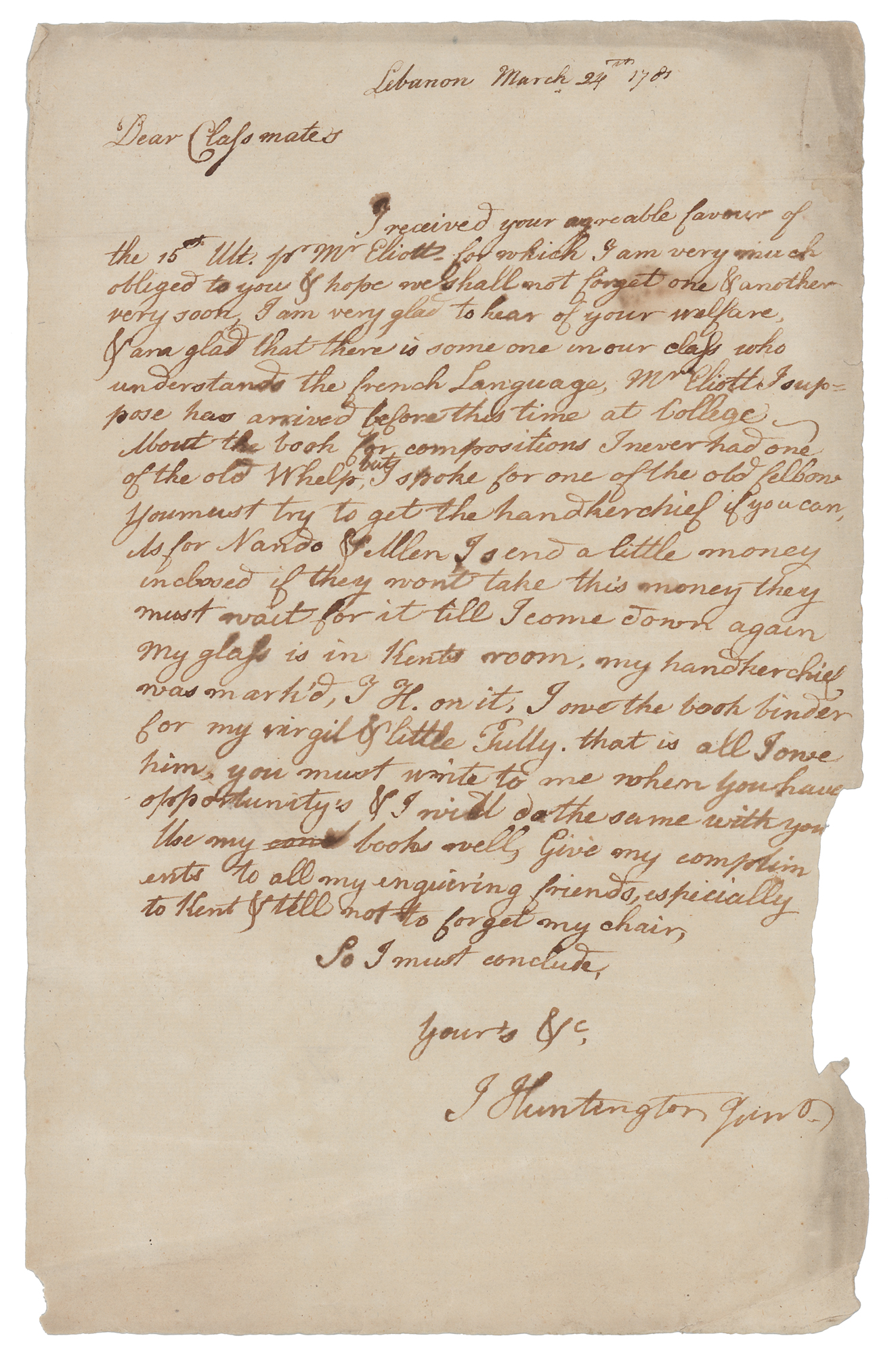 Revolutionary War general and, later, treasurer of Connecticut (1743-1818). ALS signed "J. Huntington, Gen'l," one page, 8.5 x 13, March 24, 1781. Handwritten letter to his "Dear Classmates," in part: "I am glad that there is some one in our class who understands the French language, Mr. Eliott I suppose has arrived before this time at College. About the book for compositions I never had one of the old Whelp, but I spoke for one of the old fellow. You must try to get the handkerchief if you can, as for Nando & Allen I send a little money inclosed if they won't take this money that must wait for it till I come down again…I owe the book binder for my Virgil & little Tully. That is all I owe him." In very good condition, with some creasing, and areas of paper loss.