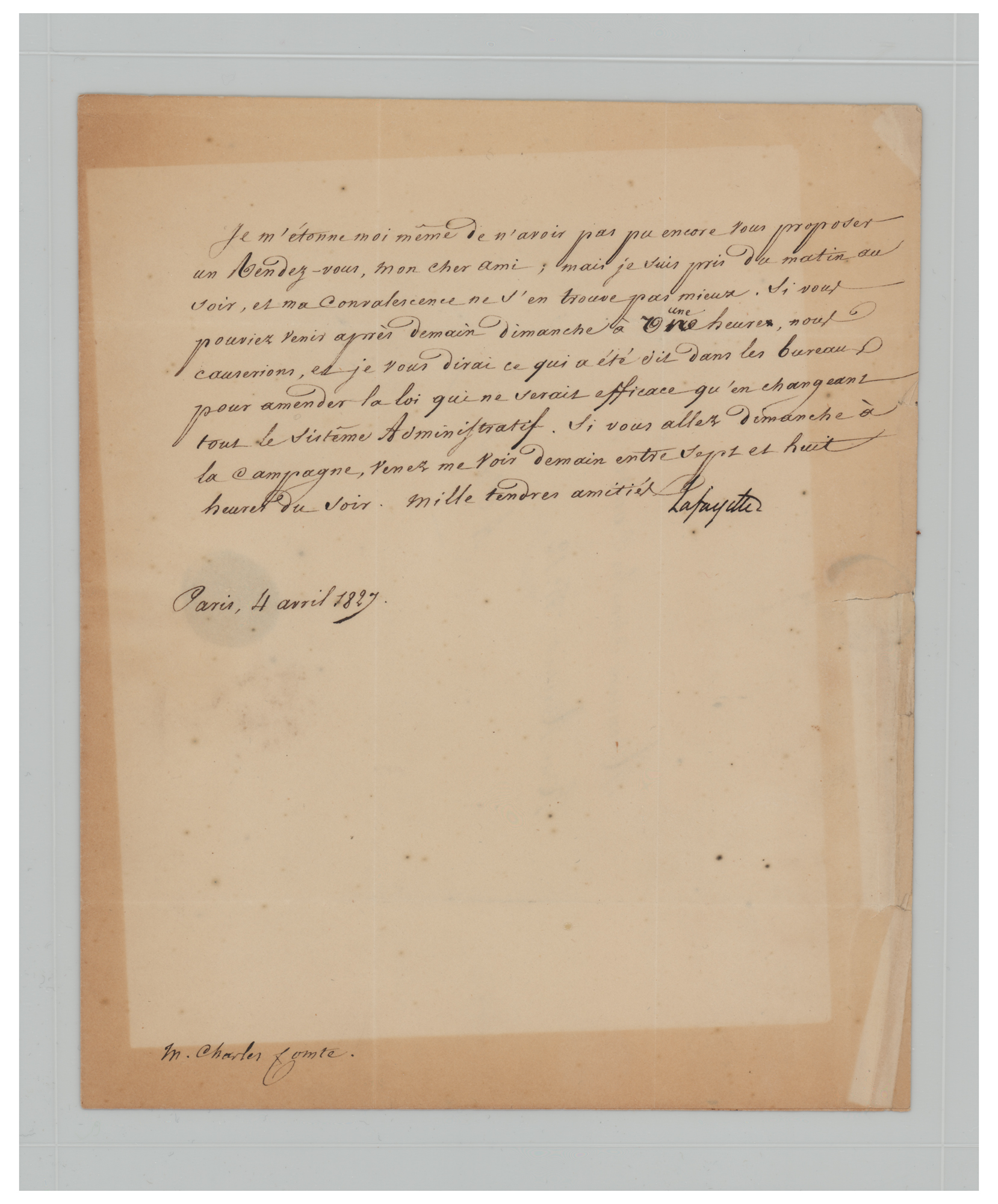 LS in French, signed “Lafayette,” one page, 7.25 x 8.75, April 4, 1827. Letter to the French lawyer, journalist and political writer Charles Comte, in part (translated): "I am astonished myself that I have not yet been able to offer you an appointment, my dear friend; but I am taken from morning to evening, and my convalescence does not find me any better. If you could come after tomorrow Sunday at one o'clock, we would talk, and I will tell you what was said in the offices to amend the law which would be effective if all the administrative systems were not changed." In very good condition, with irregular toning to the perimeter, and a repaired tear to the right edge. Accompanied by an engraved portrait of Lafayette bearing a facsimile signature.