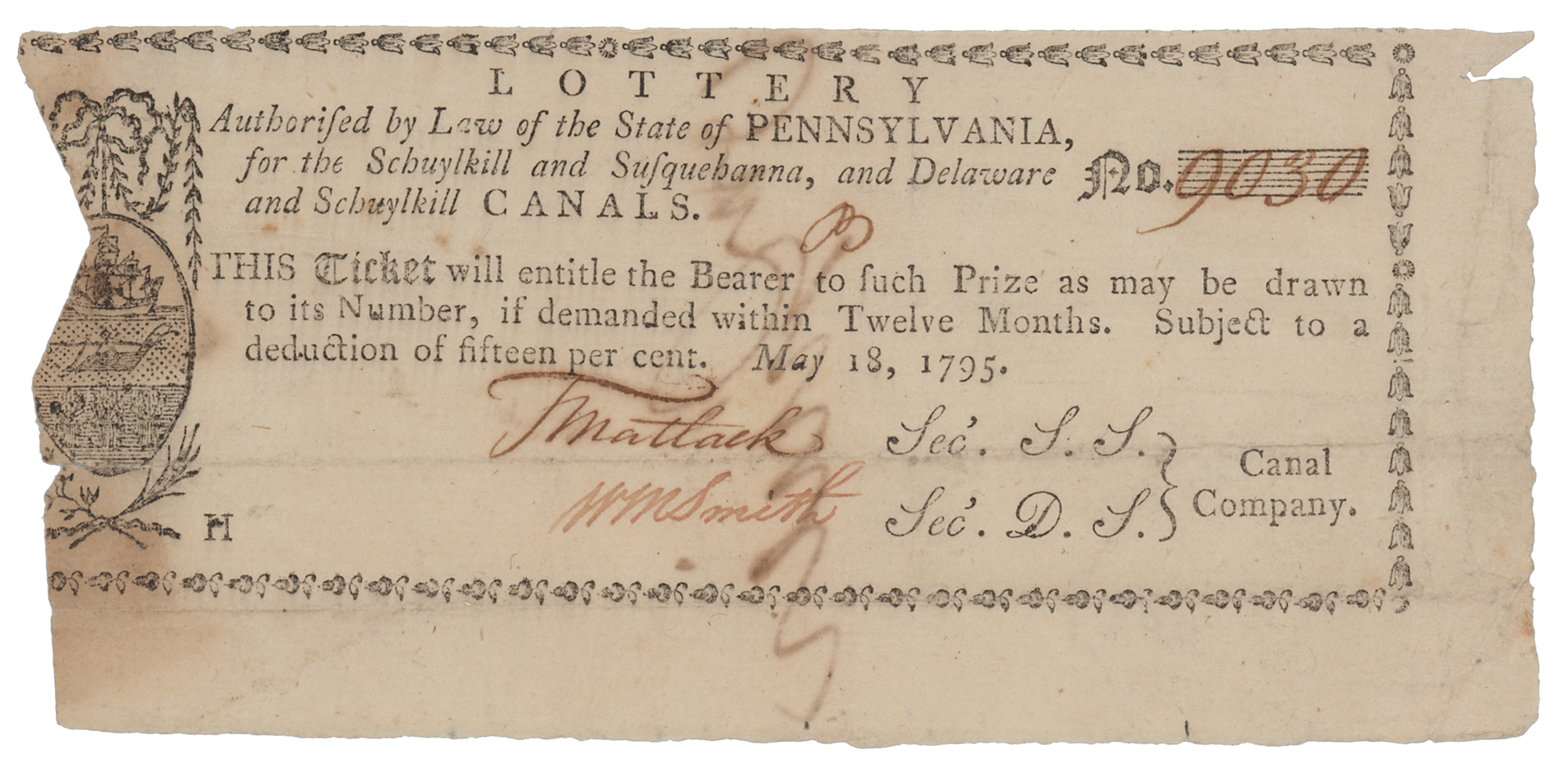 Political leader from Pennsylvania best known for engrossing the Declaration of Independence on parchment (1736-1829). Engraved 6.25 x 3 lottery ticket issued by the State of Pennsylvania to fund the "Schuylkill and Susquehanna, and Delaware and Schuylkill canals," May 18, 1795, signed at the bottom in ink, "T. Matlack" and "W. M. Smith." In very good to fine condition, with toning and paper loss to the left edge.