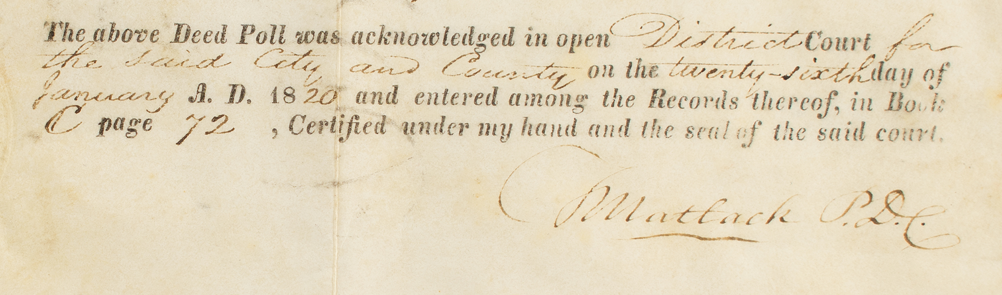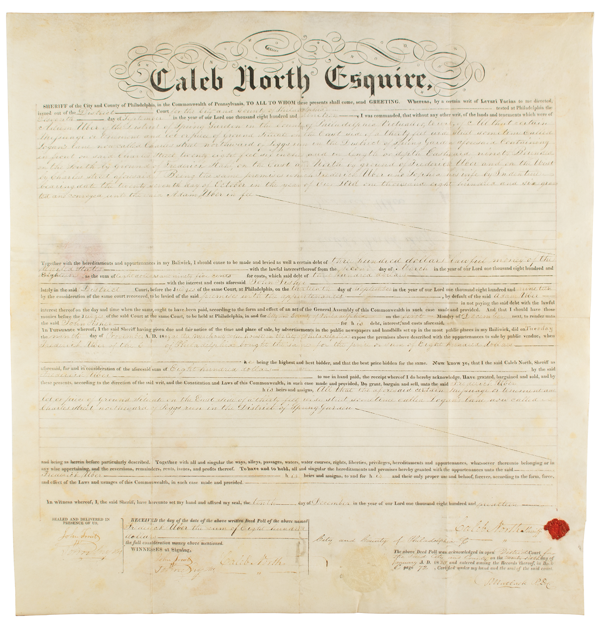 Political leader from Pennsylvania best known for engrossing the Declaration of Independence on parchment (1736-1829). Partly-printed vellum DS, signed “T. Matlack D.P.C.,” one page, 20 x 21, January 26, 1820. Deed poll issued by Caleb North, sheriff of the city and county of Philadelphia, Pennsylvania, to Frederick Uber, concerning the estate of a relative. In part: "I was commanded, that without any other writ, of the lands and tenements which were of Adam Uber?Together with the hereditaments and appurtenances in my Bailiwick, I should cause to be made and levied as well a certain debt of three hundred dollars lawful money of the United States." Signed at the conclusion by Matlack as Prothonotary of the District Court, signed twice by Caleb North, and by two witnesses. In fine condition.