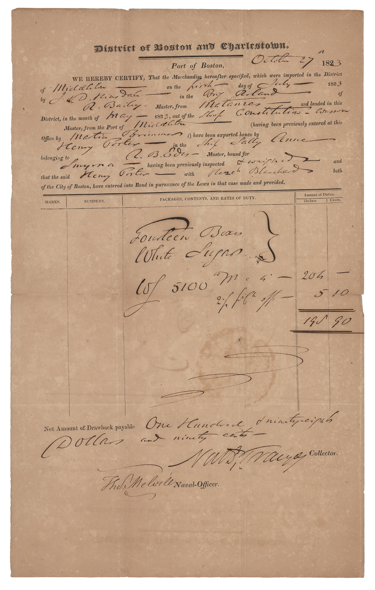 Naval officer and member of the Sons of Liberty who participated in the Boston Tea Party (1751-1832). Partly-printed DS, signed “Tho's Melvill,” one page, 10 x 16, October 27, 1823. Port of Boston and Charlestown certificate for the importation of "Fourteen Boxes White Sugar," signed at the conclusion in ink by Melvill as naval-officer and Nathaniel Tracy as collector. In very good to fine condition, with overall mottling.