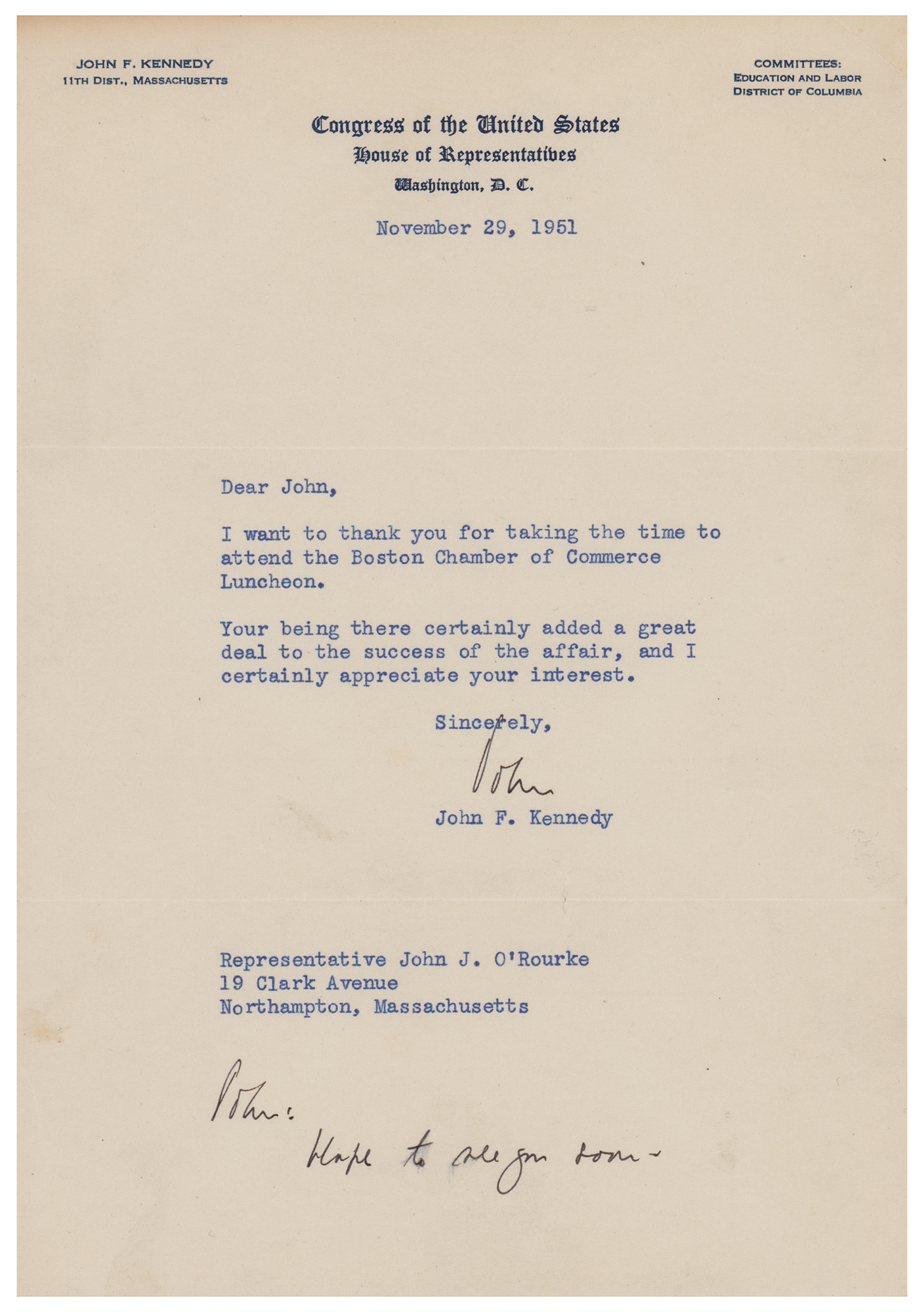 TLS signed “John,” one page, 6.25 x 9, personal Congress of the United States letterhead, November 29, 1951. Letter to fellow Massachusetts Representative John O'Rourke, in full: "I want to thank you for taking the time to attend the Boston Chamber of Commerce Luncheon. Your being there certainly added a great deal to the success of the affair, and I certainly appreciate the interest." Kennedy adds a handwritten postscript: "John: Hope to see you soon." In fine condition, with a slight brush to the postscript.