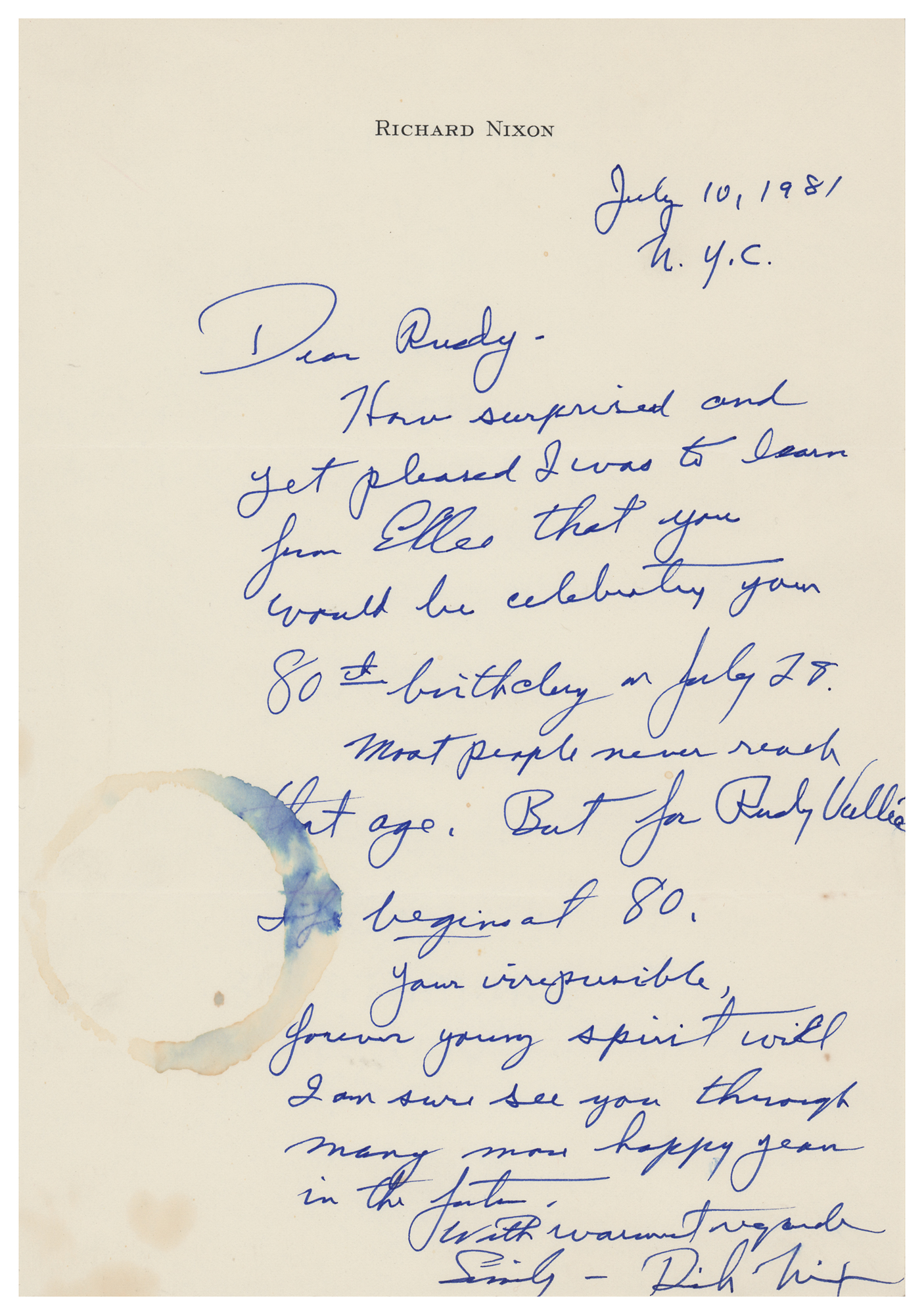 ALS signed “Dick Nixon,” one page, 7.25 x 10.5, personal letterhead, July 10, 1981. Handwritten letter to entertainer Rudy Vallee, in full: "How surprised and yet pleased I was to learn from Elle that you would be celebrating your 80th birthday on July 28. Most people never reach that age. But for Rudy Vallee life begins at 80. Your irrepressible, forever young spirit will I am sure see you through many more happy years in the future." In fine condition, with a drinking glass stain, and some other smaller stains, to the lower left.