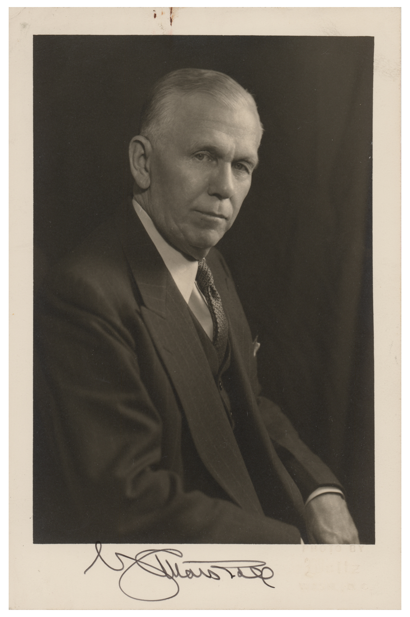 Vintage matte-finish 5 x 7.5 photo of George Marshall in a seated pose, signed in the lower border in fountain pen, "G. Marshall." Lower right blindstamped by the Woltz Studio of Washington, D.C. In fine condition, with a rusty paperclip impression to the top edge.