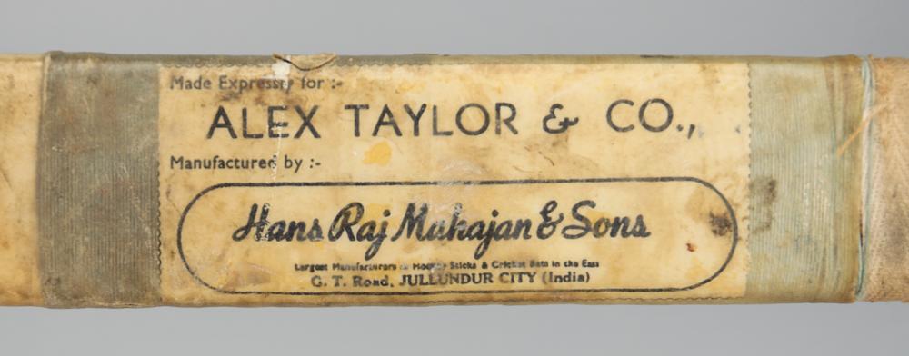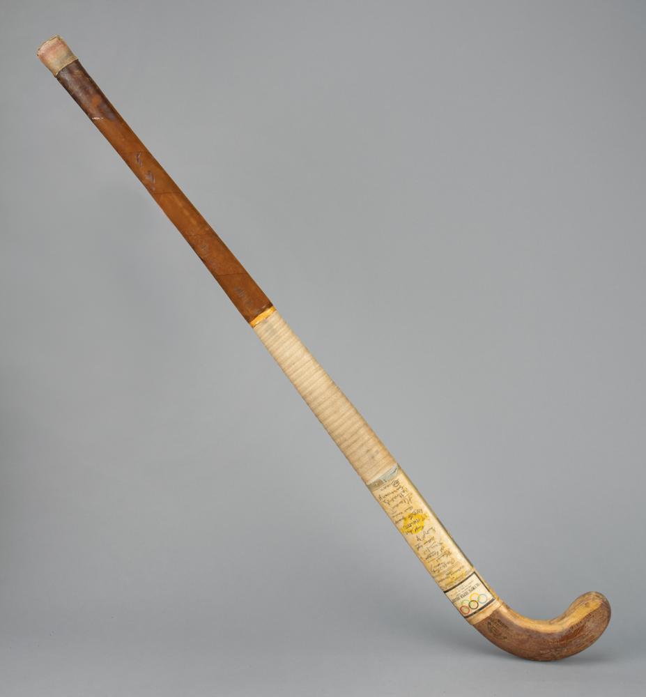 Vintage “Olympic Super Delux” field hockey stick made by Hans Raj Mahajan & Sons, 36.25″ in length, with label to shaft marked, “Hockey Sticks as used by the Indian Olympic Hockey Team at Melbourne Olympiad 1956,” with a list of facsimile signatures of the gold medal-winning team below. The No. 18 stick was made expressly for Alex Taylor & Co., and bears an EGO number of 182879. In very good to fine condition. The men's field hockey tournament at the 1956 Summer Olympics was the eighth edition of the field hockey event for men at the Summer Olympics. Contested from November 23 to December 6, India won the gold medal for the sixth successive Games, not allowing a single goal against in the entire tournament.