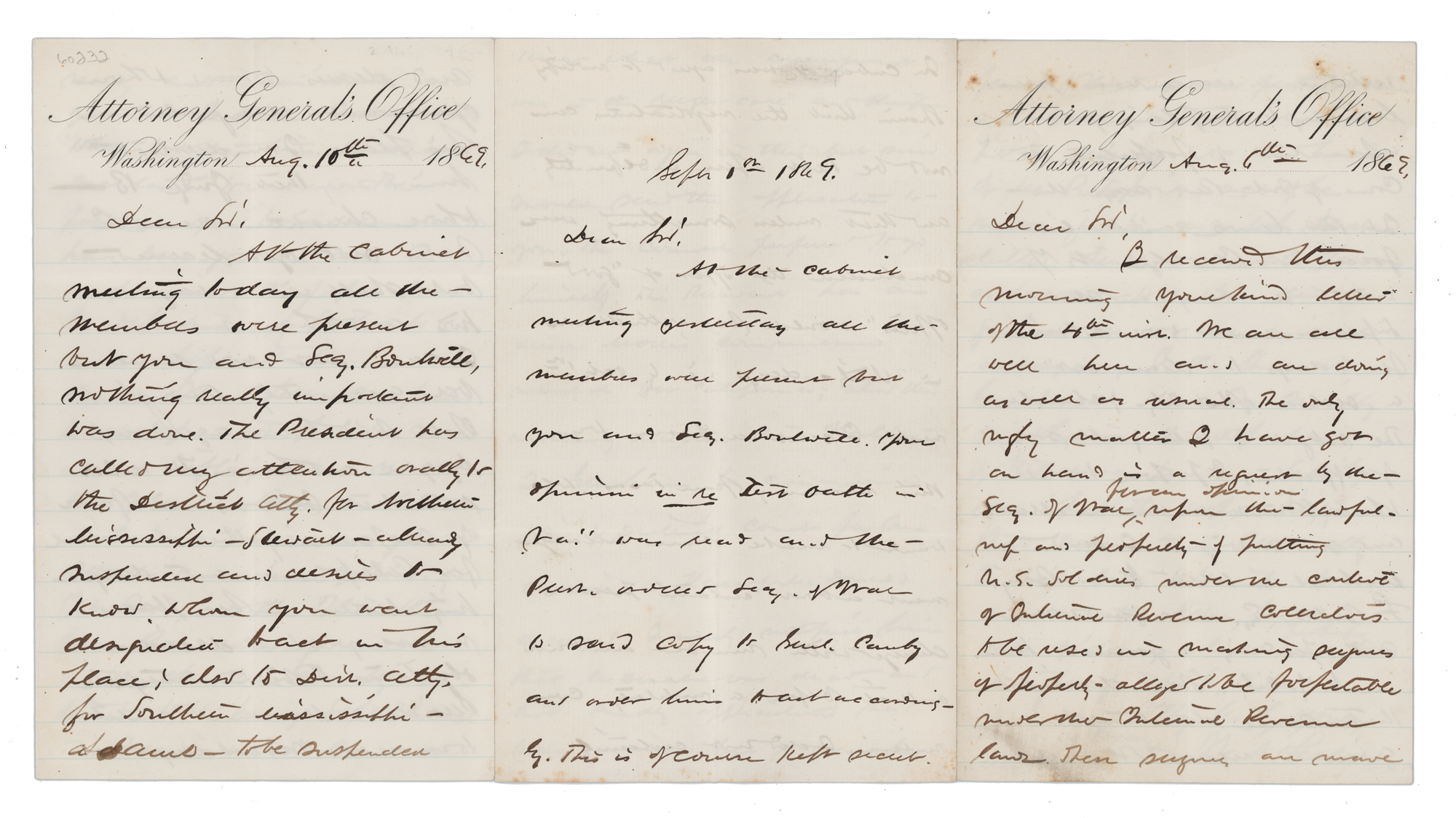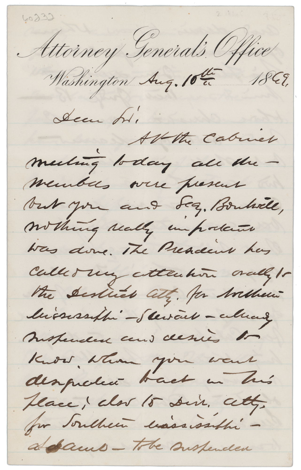 The second, August 10, 1869, in part: "At the Cabinet meeting today all the members were present but you and Secy. Boutwell, nothing really important was done. The President has called my attention orally to the District Atty. for Northern Mississippi—Stewart—already suspended and desires to know whom you want designated to act in his place; also to Dist. Atty. for Southern Mississippi—Adams—to be suspended and desires to know whom you want designated in his place.