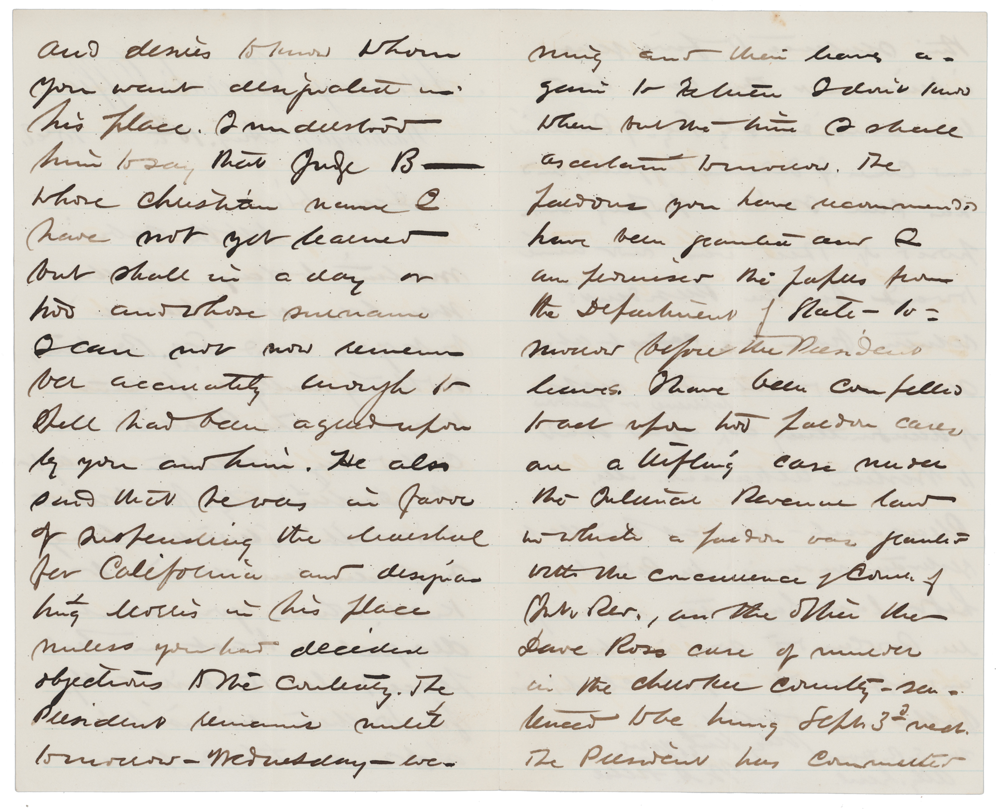I understood him to say that Judge B ____ whose Christian name I have not yet learned but shall in a day or two and whose surname I can not now remember accurately enough?had been agreed upon by you and him. He also said that he was in favor of suspending the Marshal for California?unless you had decided objections to the contrary?The pardons you have recommended have been granted and I am promised the papers from the Department of State tomorrow before the President leaves.