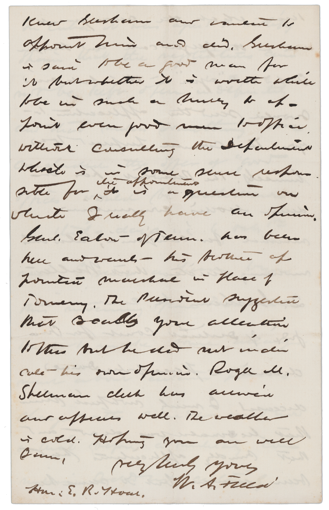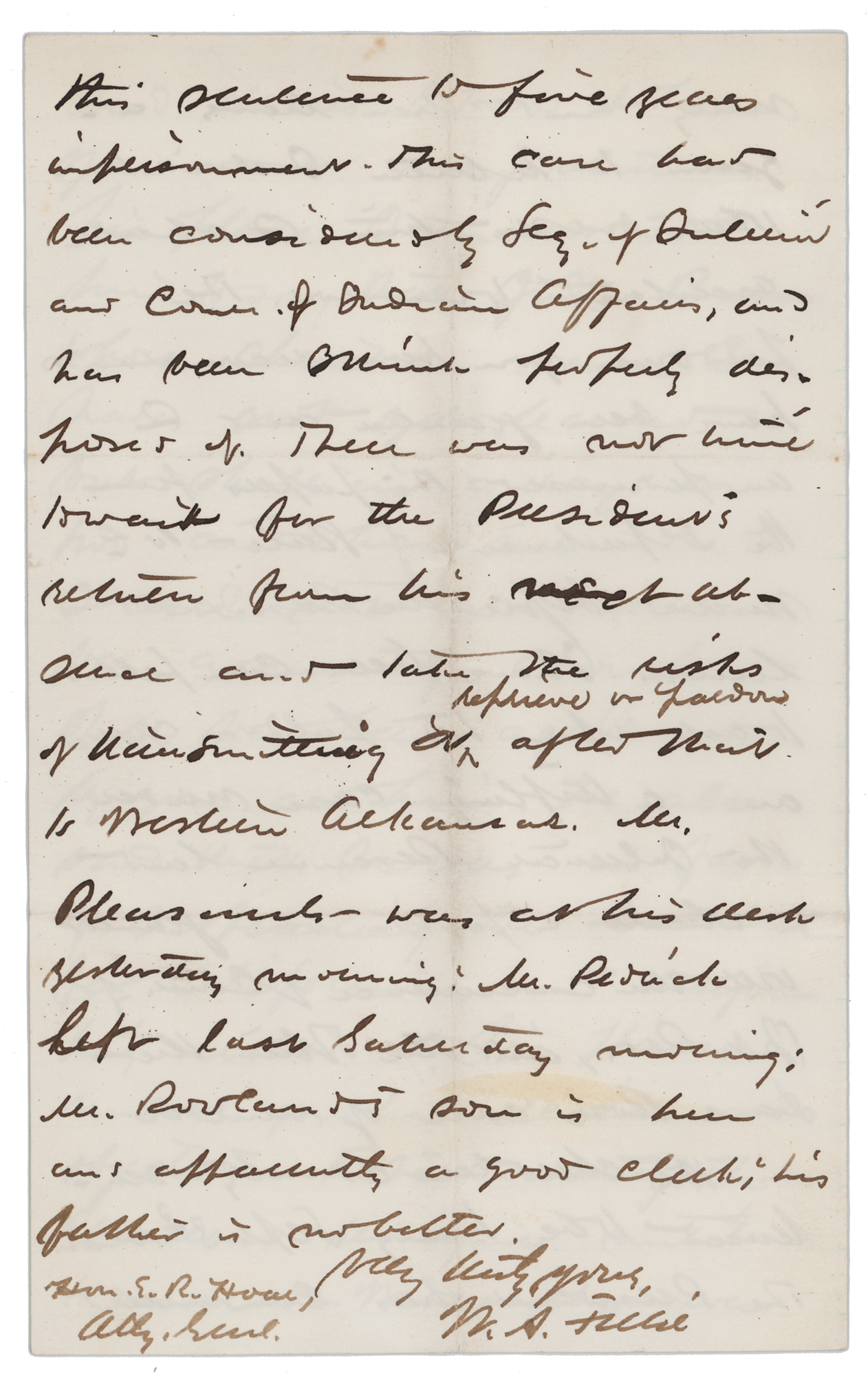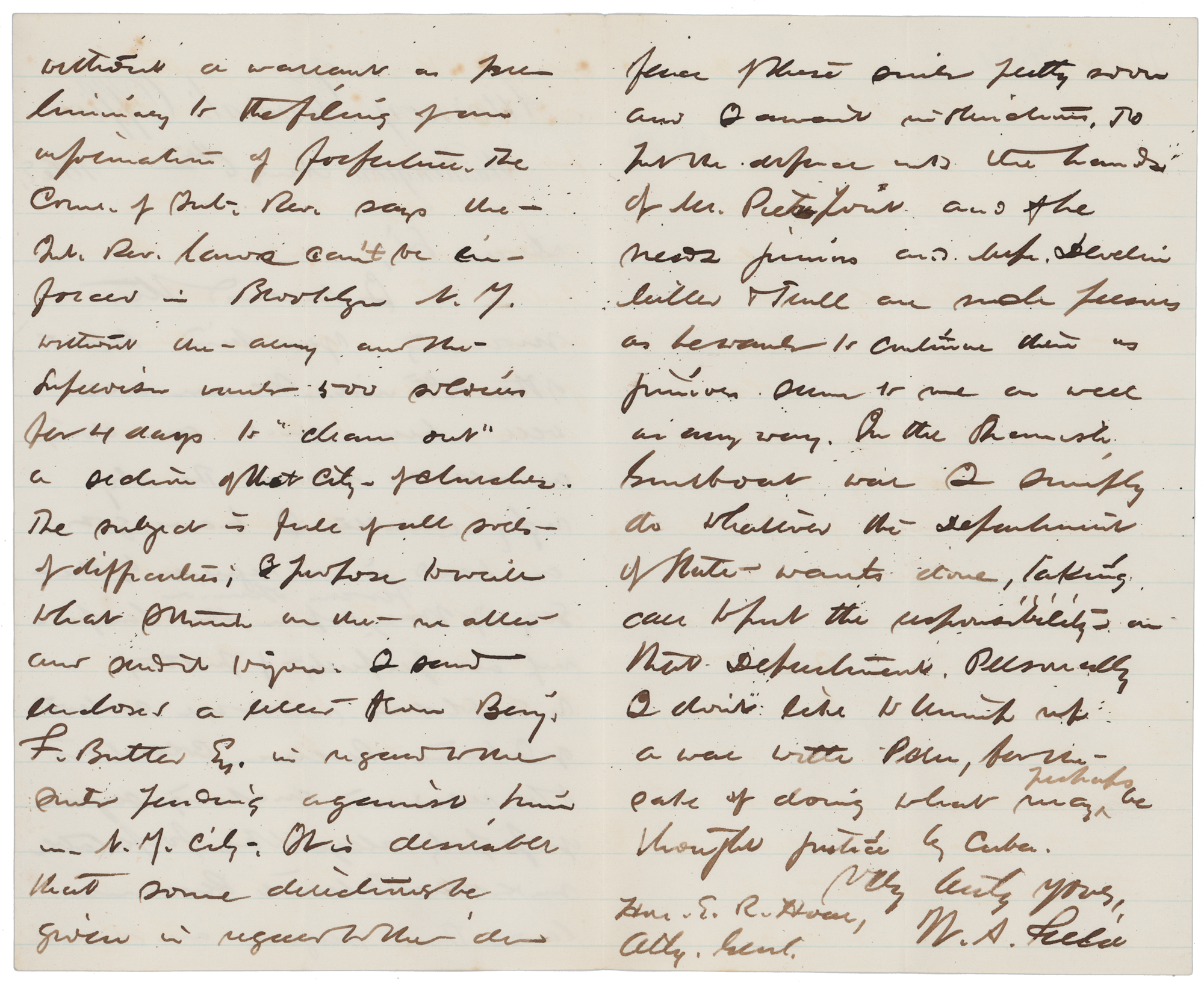 Three ALSs signed "W. A. Field" as Acting Attorney General, totaling eleven pages on sets of adjoining sheets (two on official letterhead of the "Attorney General's Office"), 5 x 8, dated August 6-September 1, 1869. All to Attorney General Ebenezer A. Hoar (apparently on leave in Concord, MA) detailing conversations with and directions from President U. S. Grant at cabinet meetings attended by Field in Hoar’s absence, as well as legal affairs, military matters, diplomacy, appointments and internal Executive Branch deliberations.
