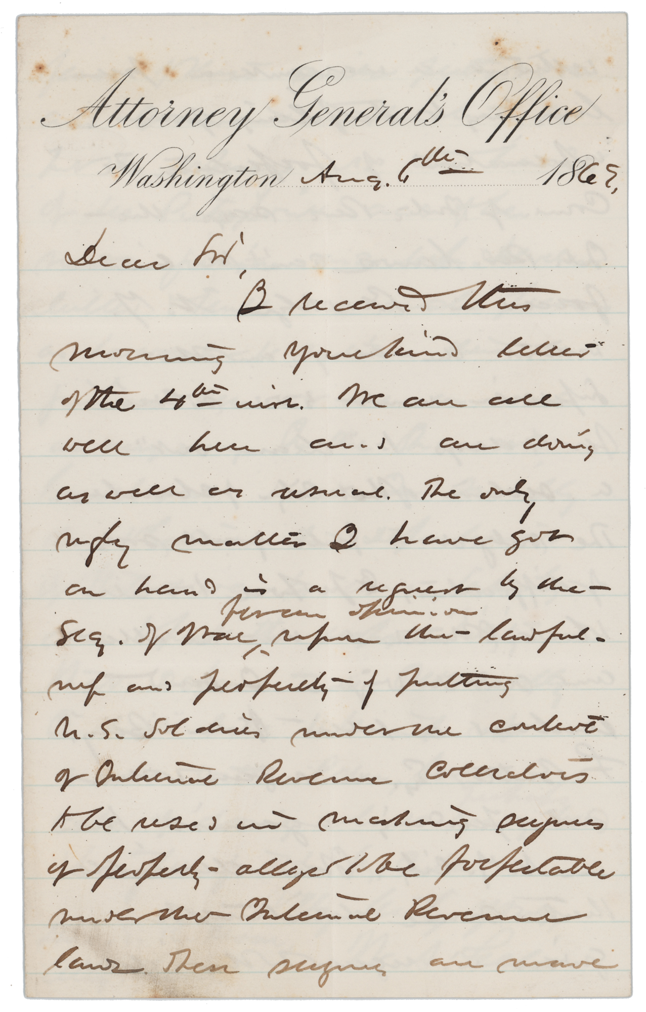 The first, August 6, 1869, in part: "We are all well here and are doing as well as usual. The only urgent matter I have got on hand is a request by the Sec. of War for an opinion upon the lawfulness and propriety of putting U.S. soldiers under the control of Internal Revenue collectors to be used in making seizures of property alleged to be forfeitable under the new Internal Revenue laws. These seizures are made without a warrant as preliminary to the filing of an imprimatur of forfeiture. The Comr. of Int. Rev. says the Int. Rev. laws can’t be enforced in Brooklyn N.Y. without the army and the supervision under 500 soldiers for 4 days?The subject is full of all possible difficulties?I send enclosed a letter from Benj. F. Butler, Esq. in regard to suits pending against him in N.Y. City. It is desirable that some directions be given in regard to these claims. Five of these suits pretty soon and I await instructions, to put the defense in the hands of Mr. Pickford?and before Devlin Miller & Trull and make filings as he wants?In the Spanish gunboat war I simply do whatever the Department of State wants done, taking care to put the responsibility on that Department. Personally, I don’t like us [starting] up a war with [Spain’s Rear Admiral] Polo, for the sake of doing what may perhaps be thought as justice by Cuba."