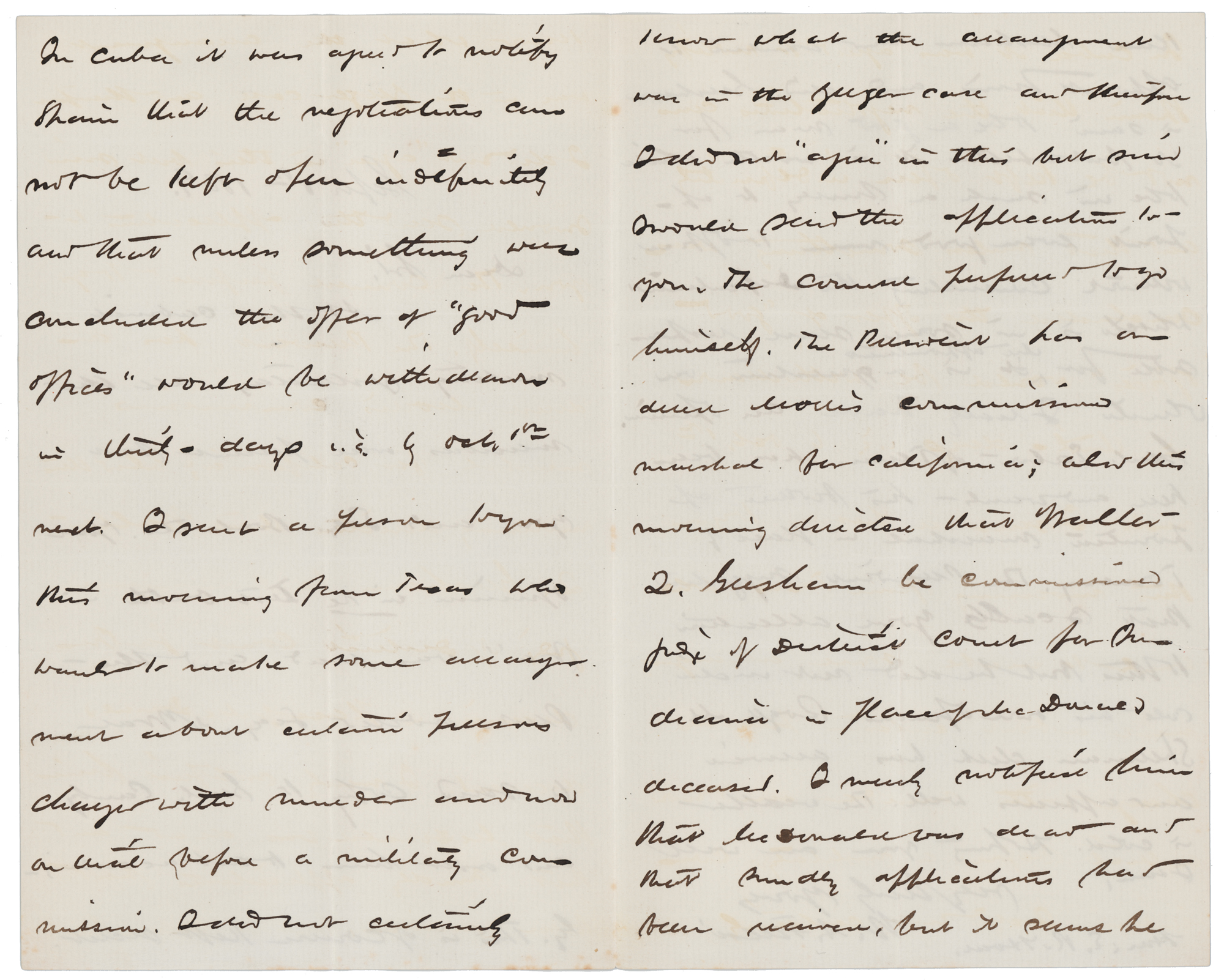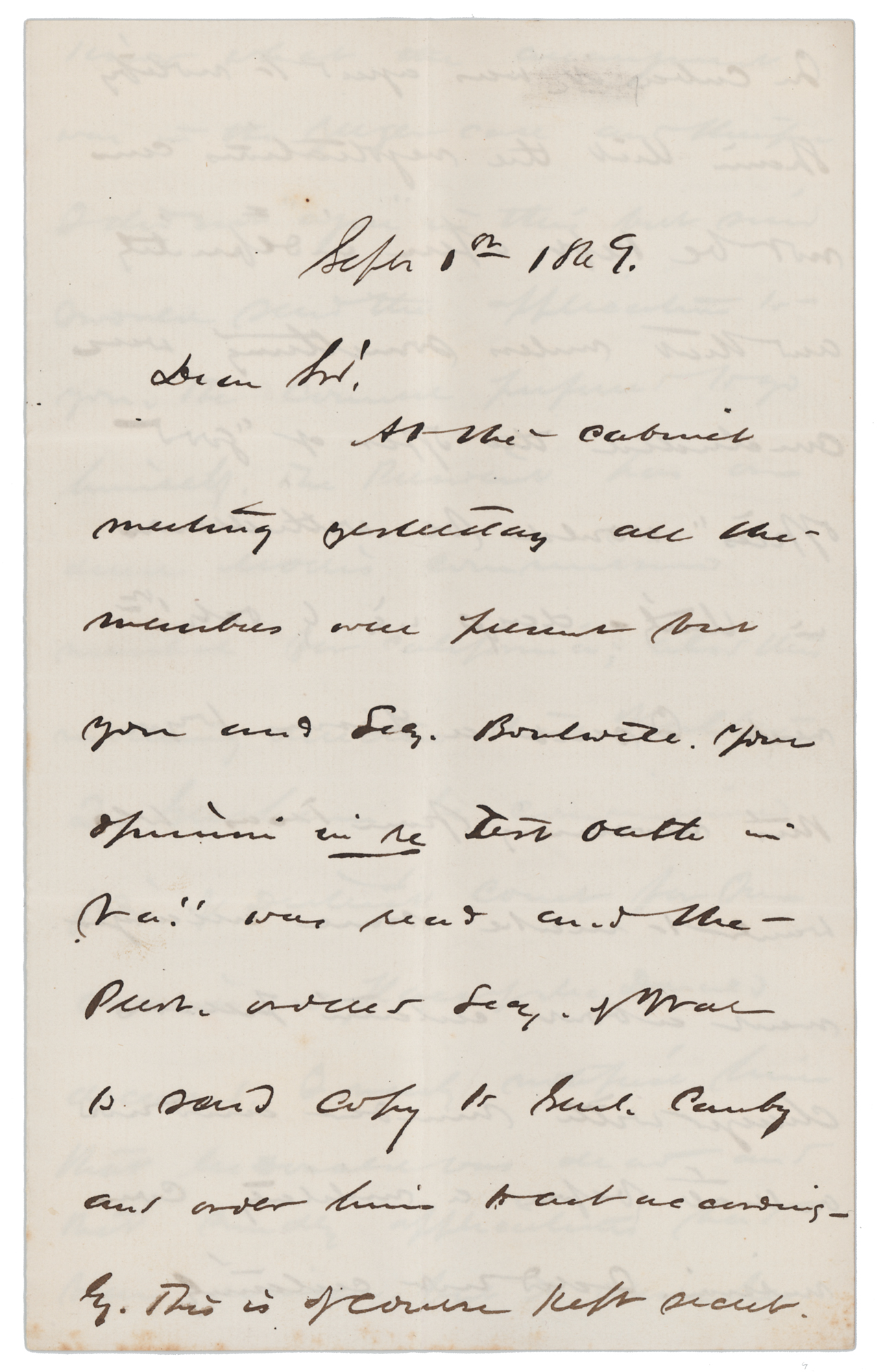 The third, September 1, 1869, in part: "At the cabinet meeting yesterday all the members were present but you and Secy. Boutwell. Your opinion in re test oath in Va. was read and the Pres't ordered Sec'y of War to send copy to Genl. Canby and order him to act accordingly. This is of course kept secret. In Cuba it was agreed to notify Spain that the negotiations cannot be kept open indefinitely and that unless something were concluded the offer of 'good offices' would be withdrawn in thirty days viz by Oct 1st next? The President has?this morning directed that Walter Q. Gresham be commissioned judge of District Court for Indiana in place of McDonald, deceased. I recently notified him that McDonald was dead and that sundry applications had been received, but it seems he knew Gresham and intended to appoint him and did. Gresham is said to be a good man for it but whether it is worth while to be in such a hurry to appoint even good men to office without consulting the Department which is in some sense responsible for the appointment is a question on which I really have an opinion."