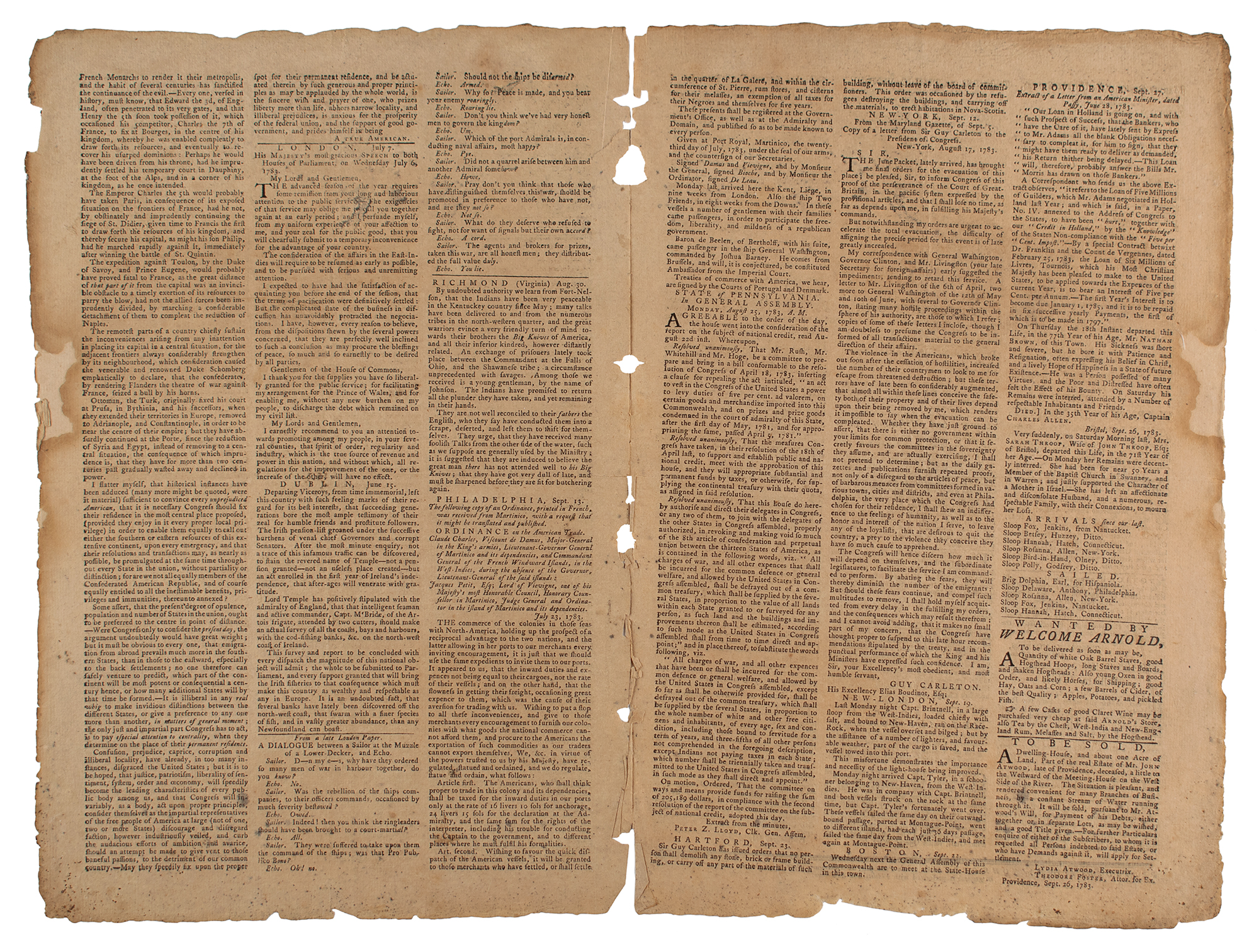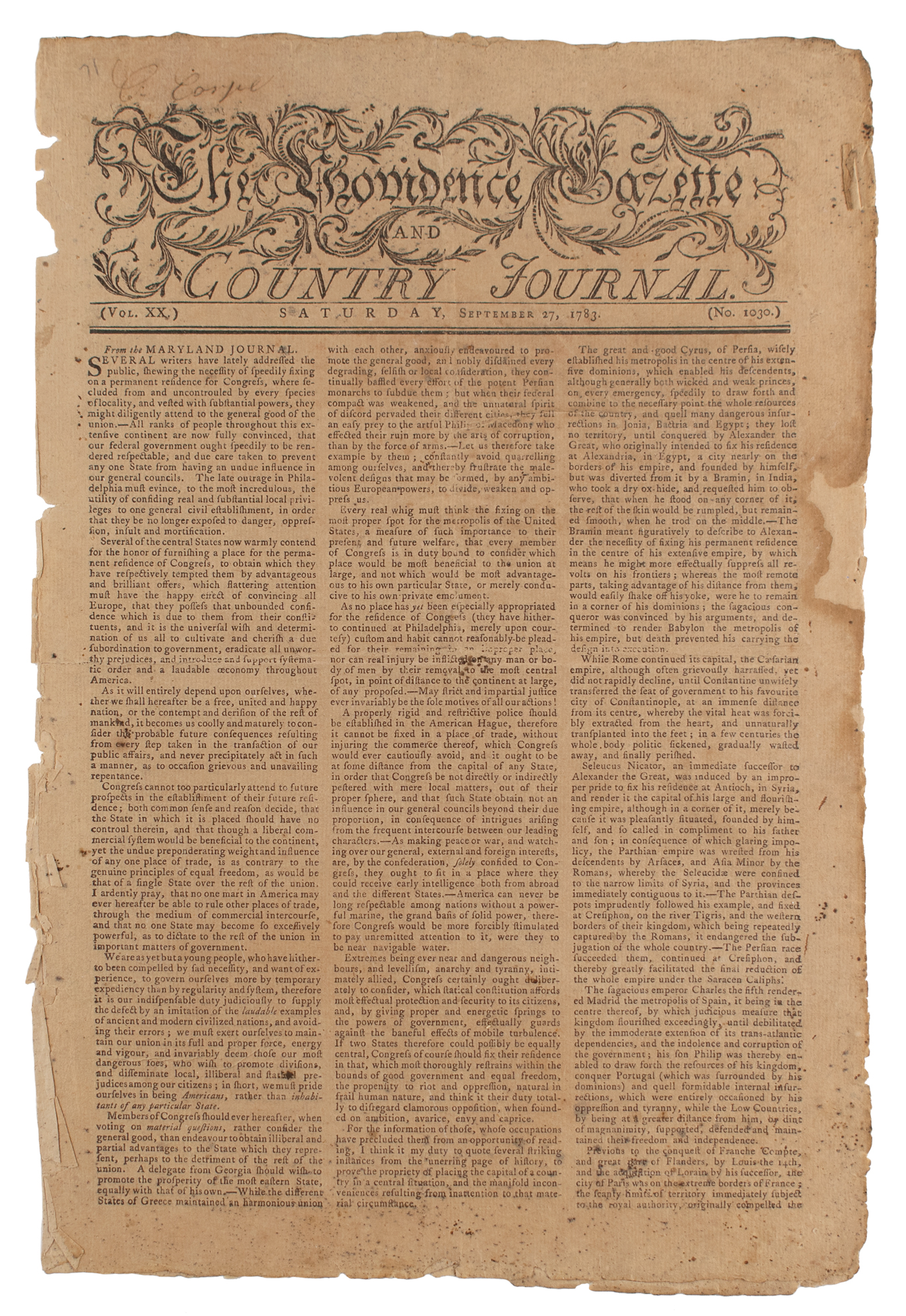 The Providence Gazette and Country Journal, September 27, 1783, printed by John Carter. His Majesty’s speech to both houses of Parliament on July 6, 1783, addressing “the terms of pacification” which involved complications and protracted negotiations among the several powers concerned. Indian affairs, including a report from Fort-Nelson that the “Indians have been very peaceable in the Kentuckey country.” Ordinance, translated from the French, concerning trade among the Colonies and French territories, dated July 23, 1783. “Treaties of commerce with America, we hear, are signed by the Courts of Portugal and Denmark. Copy of letter from Sir Guy Carleton to the President of Congress concerning final orders for the evacuation of New York, and complaining that: “The violence is in the Americans, which broke out soon after the cessation of hostilities." Report from Holland about Mr. Adams’ success in negotiating a loan of Five Million Guilders, and noting a special contract between Dr. Franklin and Count de Vergennes for Six Million Livres to the United States.