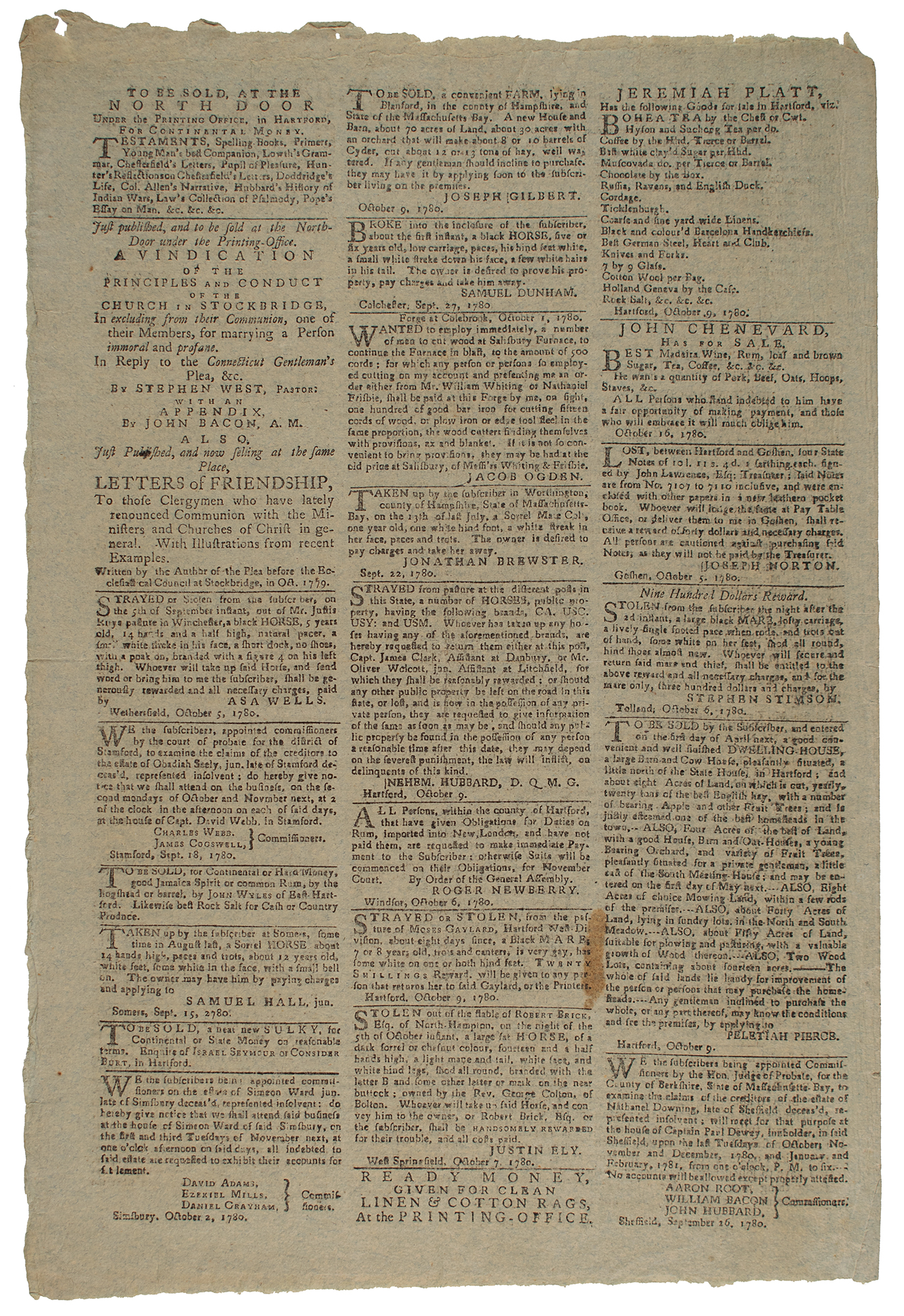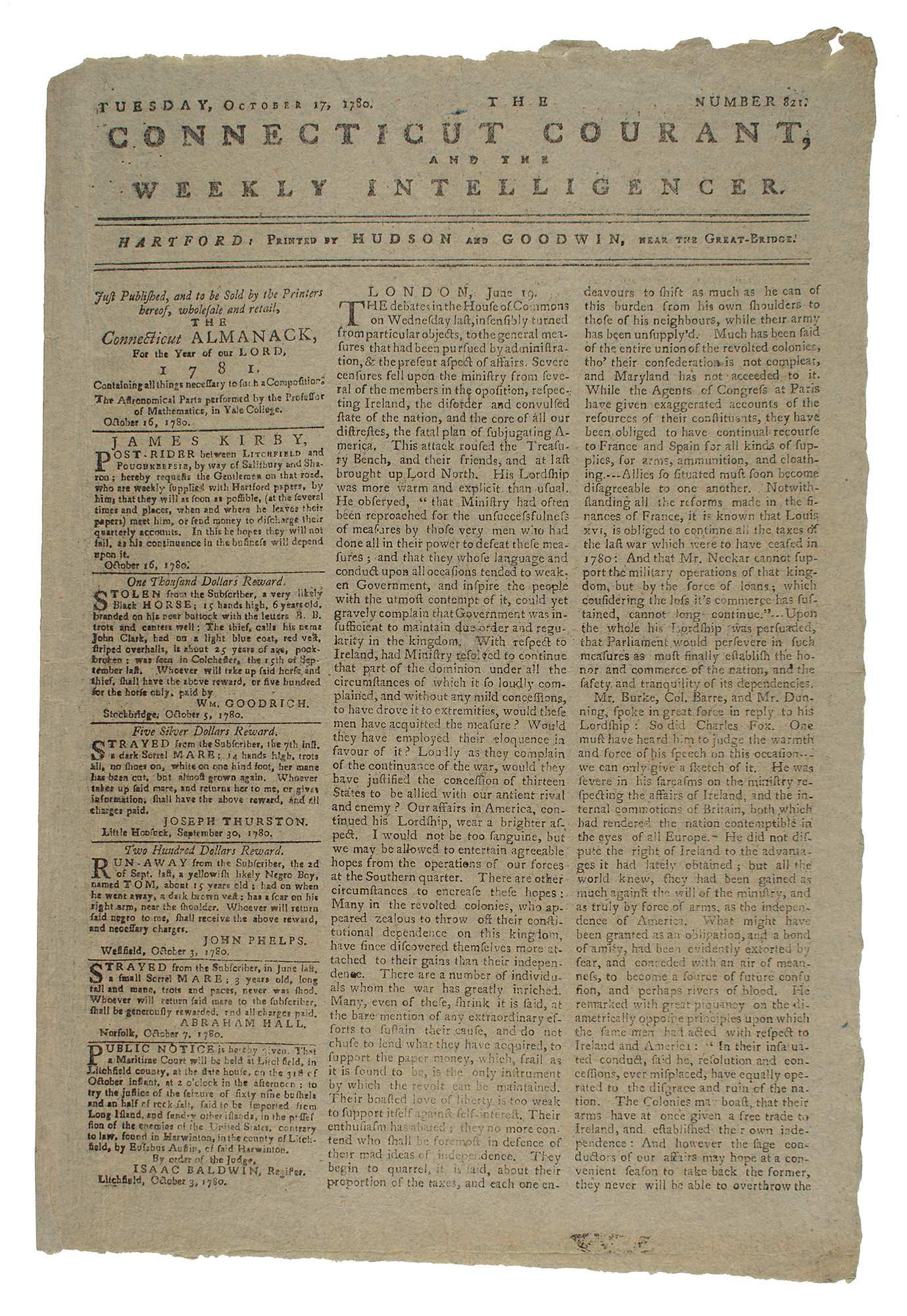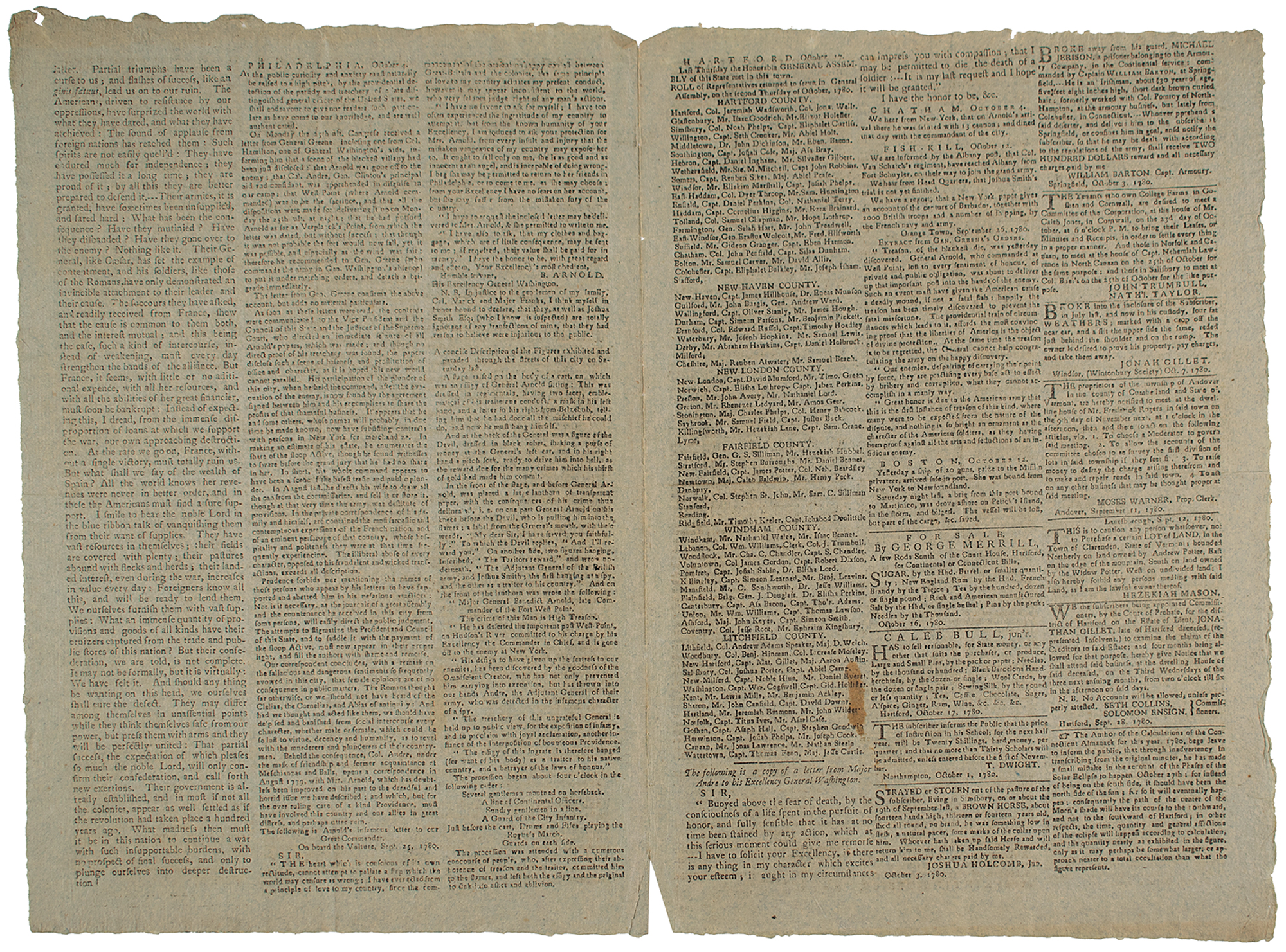 The Connecticut Courant, and the Weekly Intelligencer, October 17, 1780, printed by Hudson & Goodwin, Hartford. Possibly the best early, contemporary, authenticated account of the Gen. Benedict Arnold’s and Major John Andre’s treasonous plot to deliver West Point to the enemy. The reports are introduced with this statement to readers: “As the public curiosity and anxiety must naturally be raised to a high pitch by the providential detection of the perfidy and treachery of a late distinguished general officer of the United States, we shall endeavour to give our readers such particulars as have come to our knowledge and are well authenticated.”