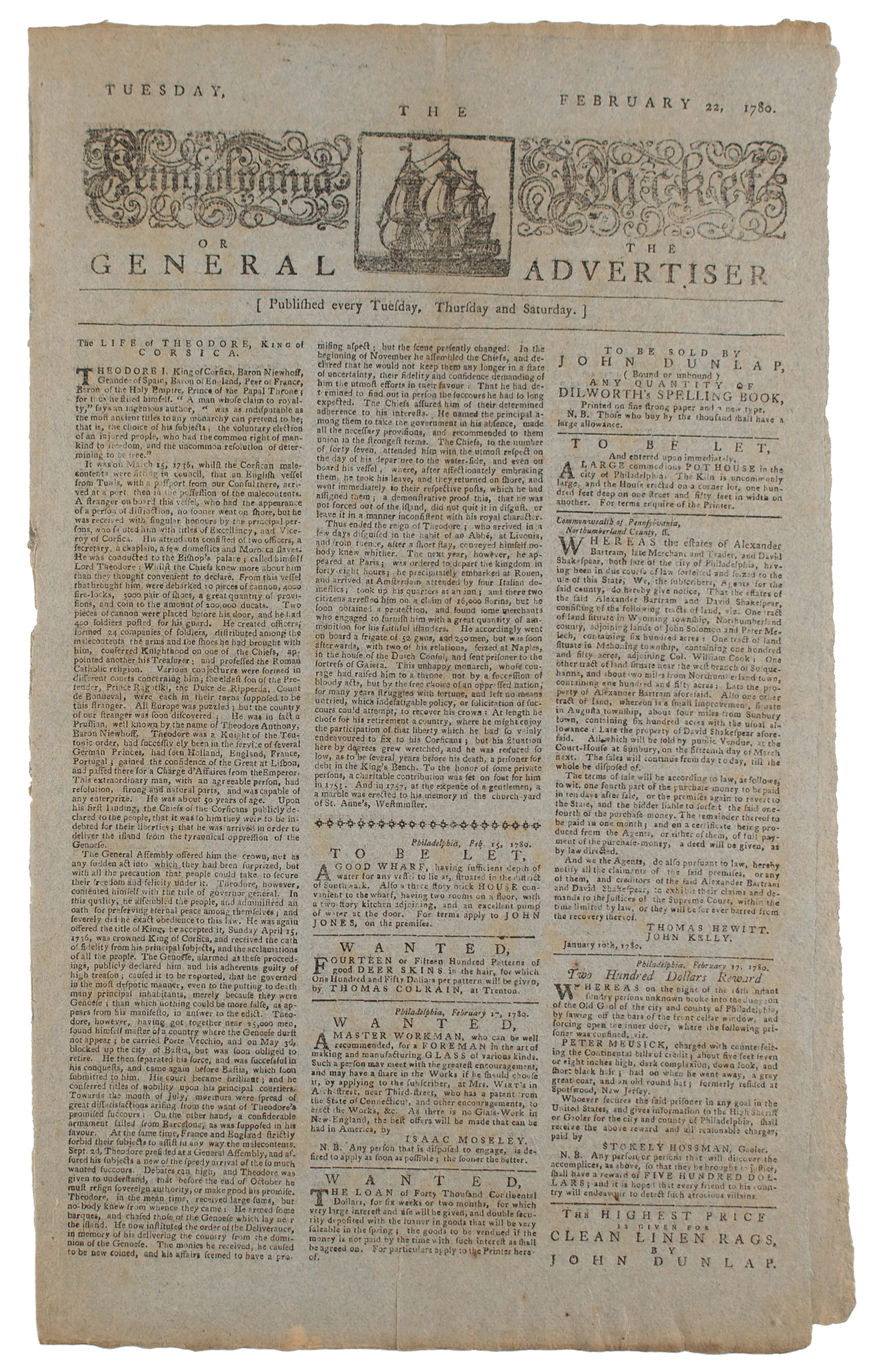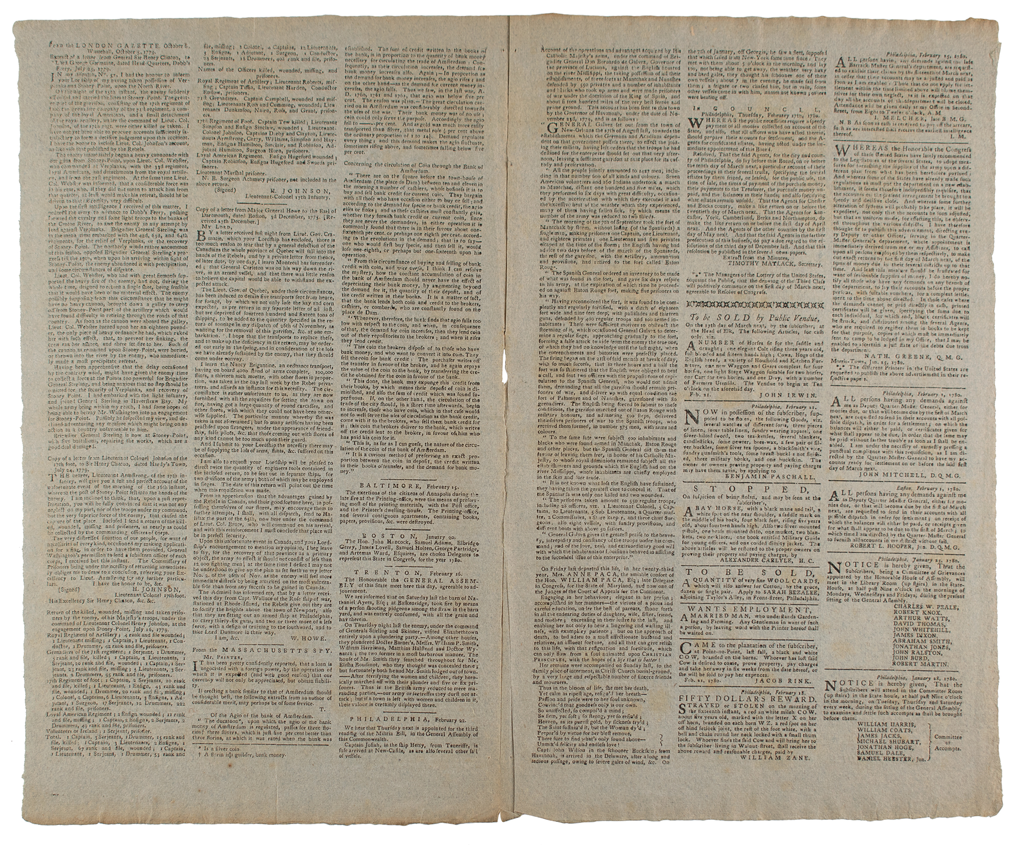 The Pennsylvania Packet or the General Advertiser, February 22, 1780, printed and sold by John Dunlap. Extract of a letter from General Sir Henry Clinton to Lord George Germaine, dated Head-Quarters, Dobb’s Ferry, July 25, 1779, concerning taking possession of Verplanks and Stoney Point upon the North River. Letter of Lt. Col. Johnson to Sir Henry Clinton, dated Hardy’s Town, July 24, 1779, informing that the post at Stoney point fell into the hands of the enemy. Return of the casualties of his Majesty’s troops at Stoney-Point. [The Battle of Stony Point took place on July 16, 1779, during the American Revolutionary War. In a well planned and executed nighttime attack, a highly trained select group of George Washington's Continental Army troops under the command of Brigadier General "Mad Anthony" Wayne defeated British troops in a quick and daring assault on their outpost in Stony Point, New York, approximately 30 mi (48 km) north of New York City.].