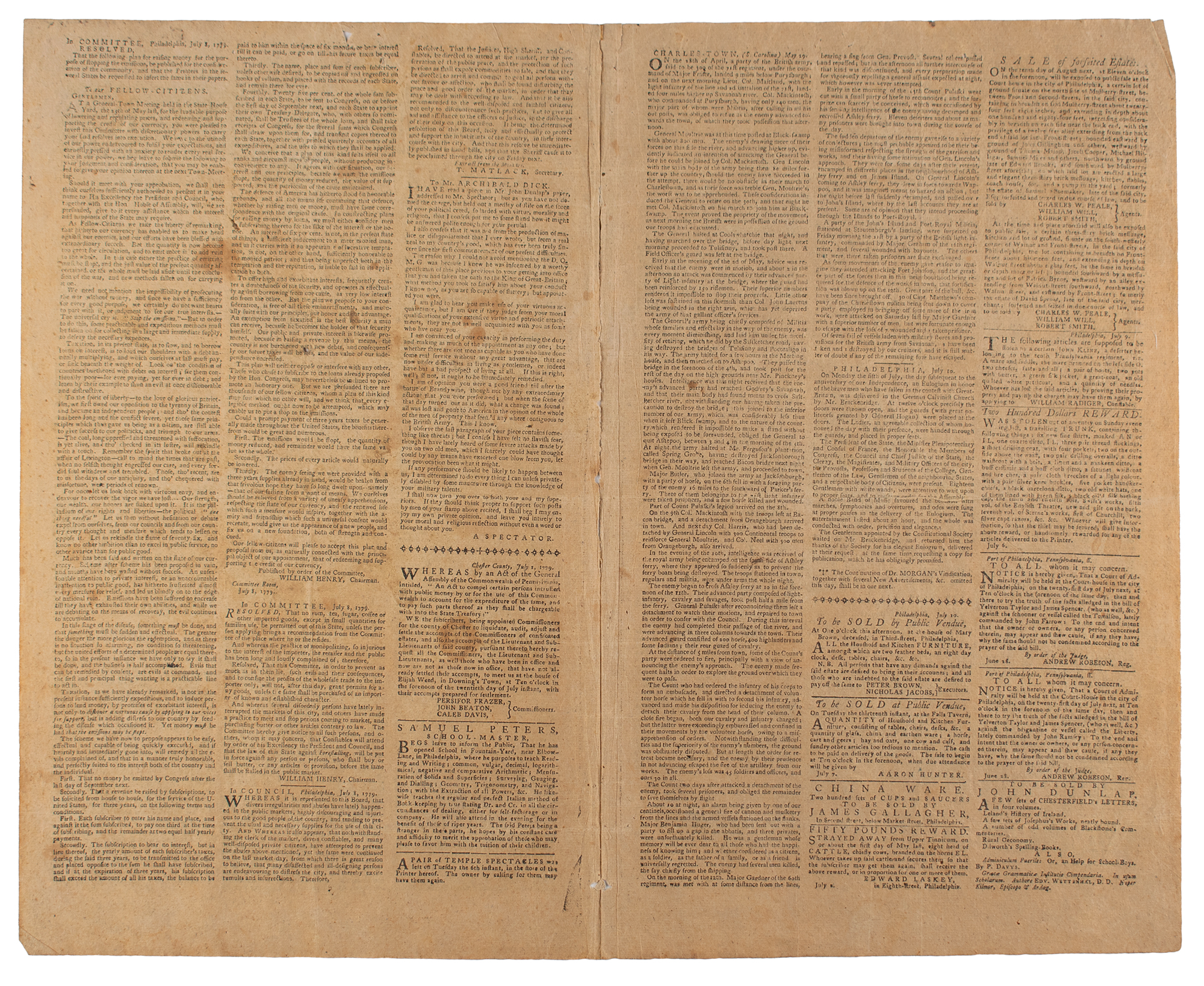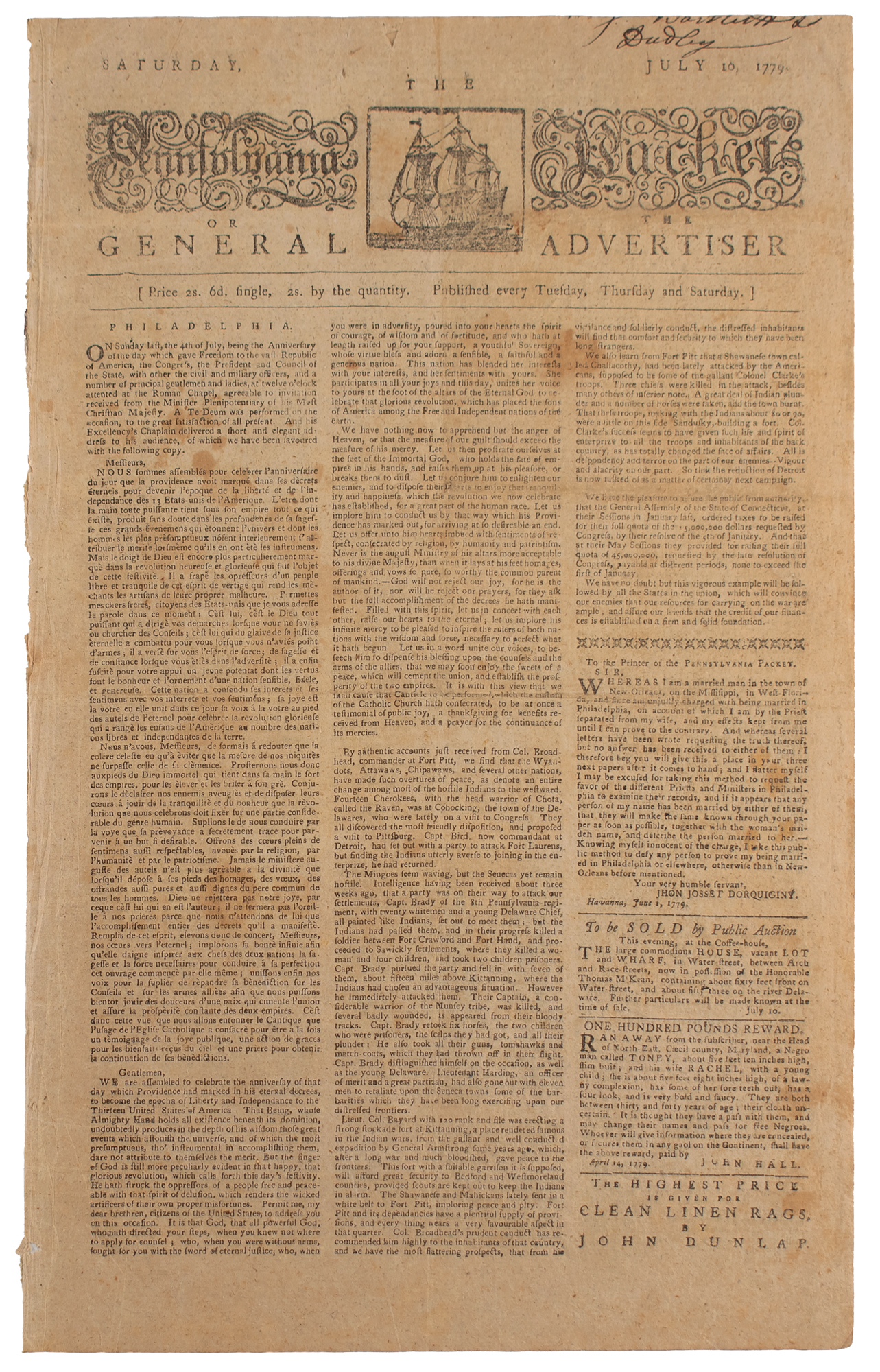 Front page printing of the French minister’s chaplain’s address reprinted in French and English. Account received from Col. Broadhead, commander at Fort Pitt, concerning overtures of peace received from several Indian Nations. Capt. Samuel Brady of the 8th Pennsylvania Regiment. Detailed account of Indian attack and kidnapping at the Sewickly settlement, and Capt. Brady’s pursuit of and attack upon the Indian party: “[Capt. Brady] immediately attacked them. Their Captain, a considerable warrior of the Munsey tribe, was killed, and several badly wounded, is appeared from their bloody tracks. Capt. Brady retook six horses, the two children who were prisoners, the scalps they had got, and all their plunder: He also took all their guns, tomahawks and match-coats, which they had thrown off in their flight.” Stockade fort being built at Kittanning, to provide security for Westmoreland and Bedford counties. Connecticut raises taxes to aid war effort at request of Congress. Resolution to lower and regulate prices, and protect credit and the currency, signed William Henry, in Committee, Philadelphia, July 8, 1779. Resolution barring large exports of rum, tea, sugar, coffee or other imported goods, and to halt monopolies and other disruptions to the market. German Calvinist Church celebration of Independence, with eulogium delivered by Mr. Brackinridge for those who had fallen in the contest with Great-Britain. Highly detailed report from Charleston about war activities in and near Savannah, including those of Count Pulaski. Advertisements for sale of forfeited estates signed by “Charles W. Peale” and others.