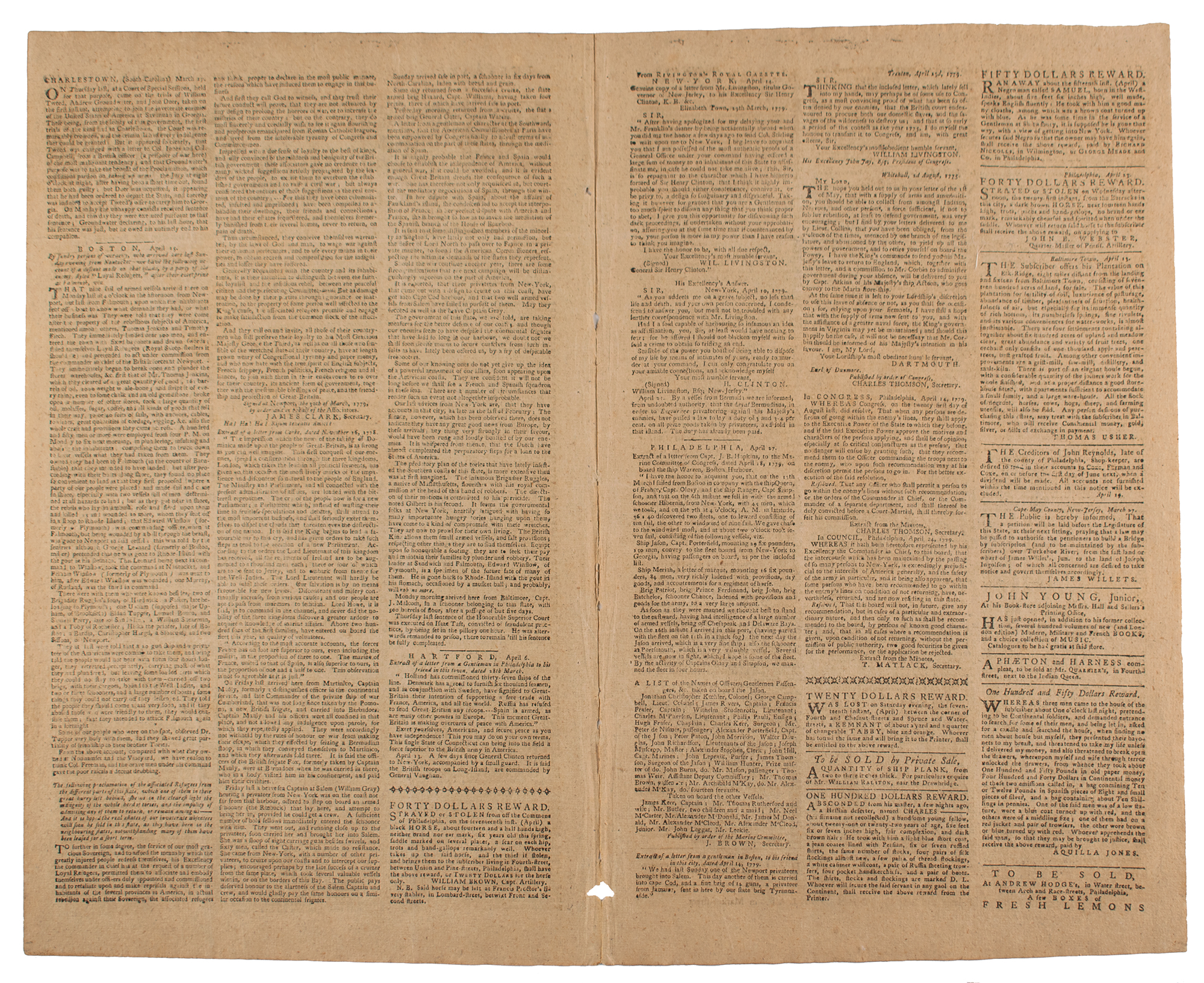 The Pennsylvania Packet or the General Advertiser, May 20, 1779; printed and sold by John Dunlap. Some discoloration and paper loss to margin on page one, no text lost. Nantucket gentlemen claimed goods that were taken from them by the Royal Refugees; claim denied by General Prescot. Brigadier General Silliman and his son taken from General’s house in Fairfield by Tories from Long-Island. [One night in May 1779, nine Tories crossed the sound in a whale boat from Lloyd's Neck. One of the Tories had been previously employed by Silliman as a carpenter, so he knew the house well. Eight of the men forced their way into the house at midnight and took the general and his adult son. They were taken to Oyster Bay, New York, and finally to Flatbush. They were later exchanged]. Considerable body of the enemy landed in Bergen County, [NJ]. Court martial of Mr. Zedwitz of New York, who attempted to give information to the enemy when the British army took possession of New York. Report of skirmish at “Closter Landing” [Bergen County, NJ].