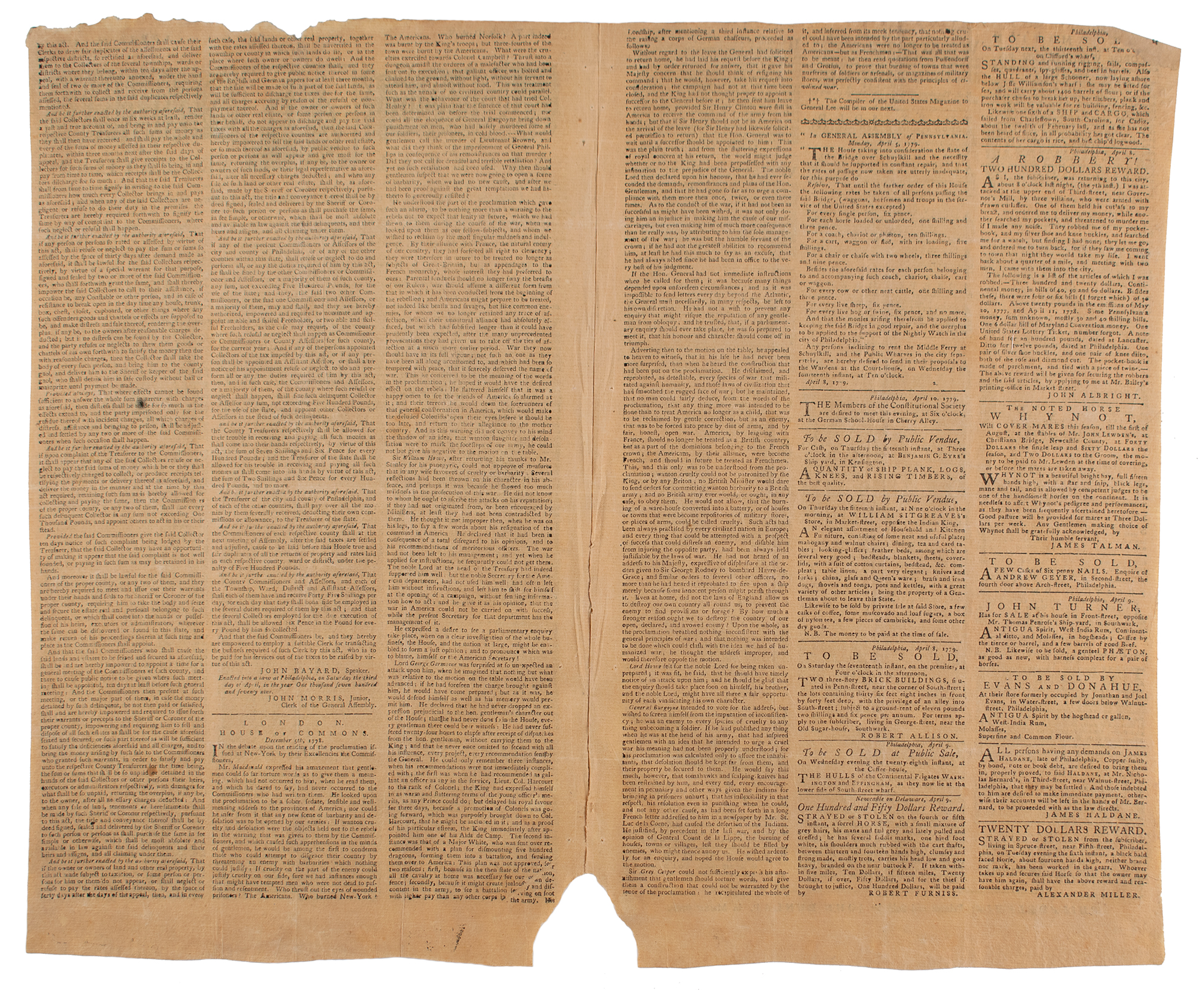 The Pennsylvania Packet or the General Advertiser, April 10, 1779; printed and sold by John Dunlap. Proclamation By His Excellency George Washington, Esq., General and Commander in Chief of the Forces of the United States of America given at Head-Quarters, Middle-Brook, March 10, 1779, conferred full pardon upon deserters provided they return to their corps by May 1, 1779. Boldly signed in type: G. WASHINGTON. Proceedings in the House of Commons in London on December 5, 1778 defending proclamation issued in New York to the provinces by Commissioners; criticizing the burning of New York and 3/4 of Norfolk by the Americans; and addressing American treaty with France: "By their alliance with France, the natural enemy of our country, they had forfeited all right to clemency; they were therefore in future to be treated no longer as subjects of Great-Britain, but as appendages to the French monarchy, whose interest they preferred to ours." Miscellaneous proceedings in General Assembly of Pennsylvania.