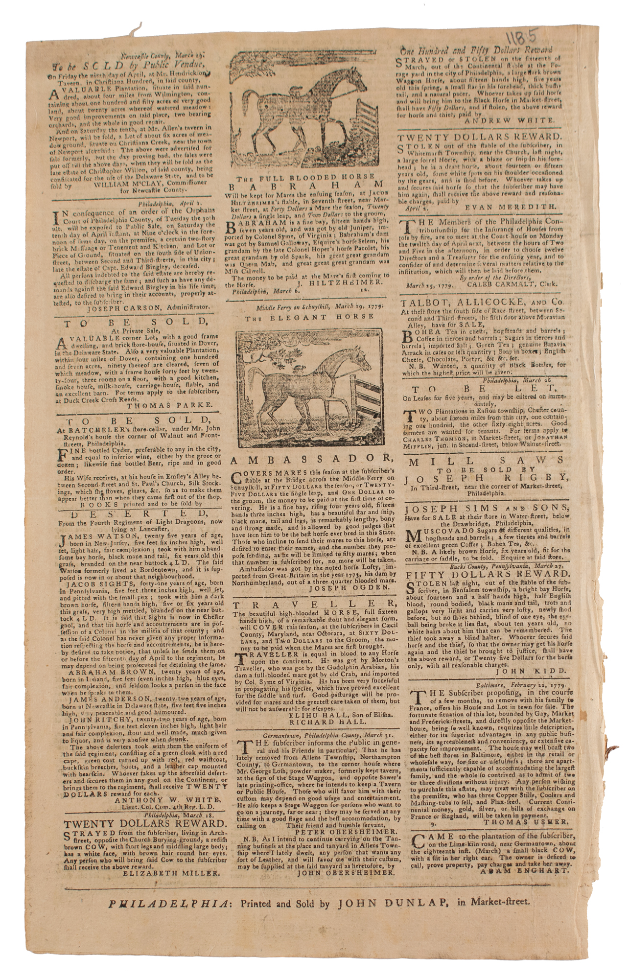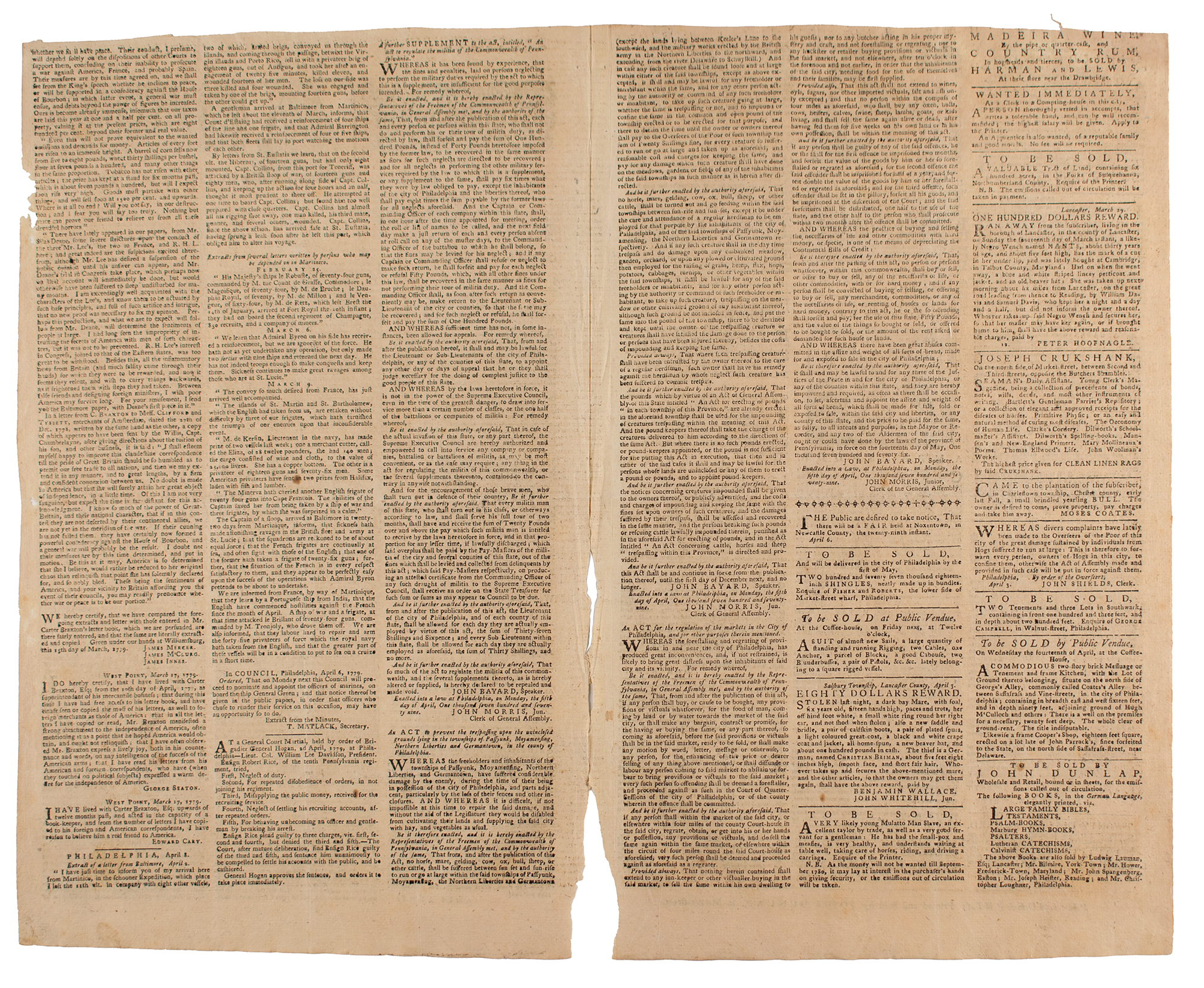 The Pennsylvania Packet or the General Advertiser, April 8, 1779; printed and sold by John Dunlap. Extensive correspondence from and involving Carter Braxton of Virginia, a signer of the Declaration of Independence; after his private correspondence to John Ross about the American treaty with the French was seized by the enemy in New York, and published, Carter Braxton strongly defended his support for American independence. Braxton’s letter of October 7, 1778 stated: "With regard to America, you find by her alliance with France she is so closely fixed to her, that she cannot in any event separate herself." Miscellaneous legislative affairs in Pennsylvania. Reward for deserters from Fourth Regiment Light Dragoons, now lying at Lancaster. Two large woodcuts of horses as part of advertisements.