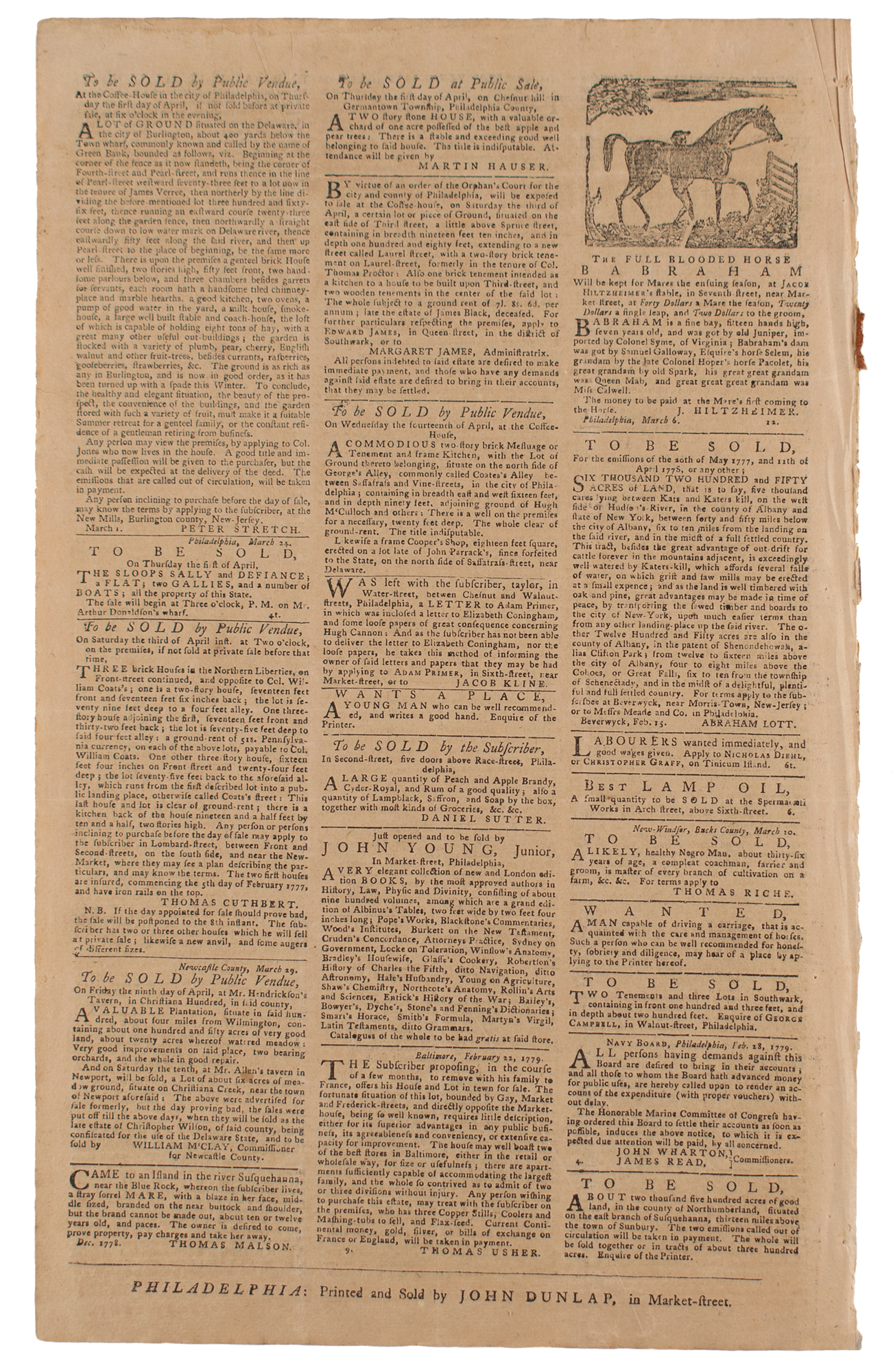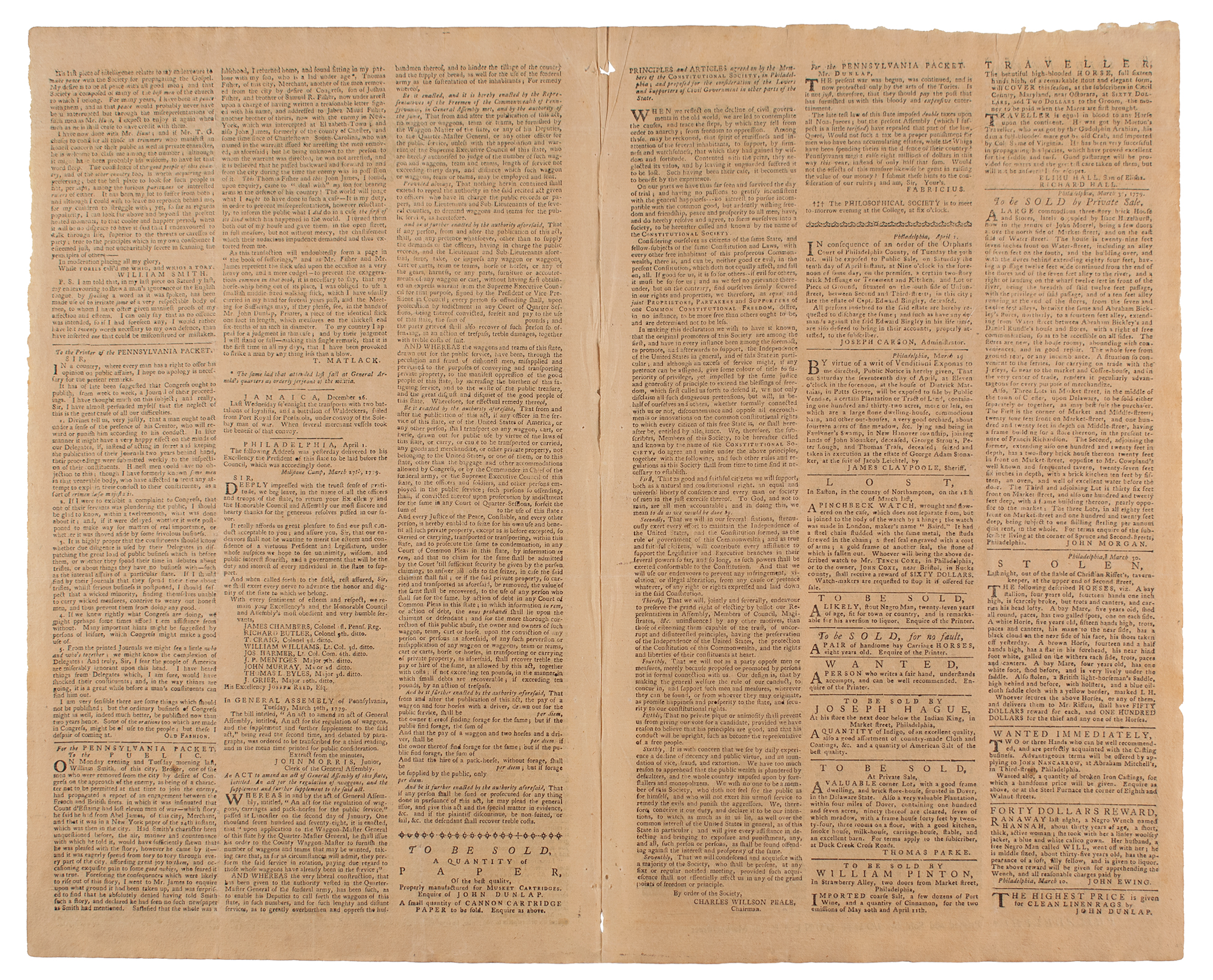 The Pennsylvania Packet or the General Advertiser, April 1, 1779; printed and sold by John Dunlap. Principles and Articles agreed to by members of the Constitutional Society in Philadelphia, signed in type by its chairman (and famous artist) Charles Willson Peale, supporting the independence of the United States, equal and universal liberty of conscience, right of electing representatives by ballot, and other aims. Large woodcut of the full-blooded horse Babraham, with advertisement. Advertisement for sale of 6,250 acres in Albany county (NY), along with other properties in Clifton Park.
