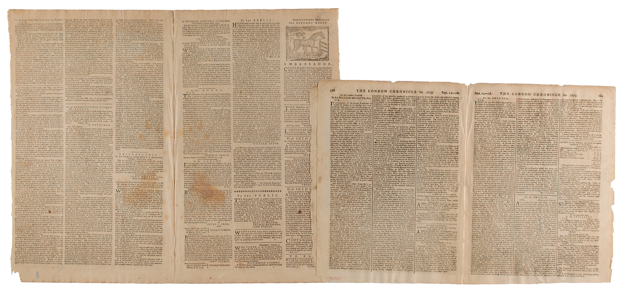 The Pennsylvania Packet or the General Advertiser, March 27, 1779; printed and sold by John Dunlap. A detailed account of General Arnold’s march from Cambridge to Quebec. Letter from "Common Sense" [Thomas Paine] addressed to Mr. Deane related to alleged financial misdeeds. Leading Colonial clergyman, William Smith, Provost of the College of Philadelphia—today, the University of Pennsylvania—was accused by one Peter Cress of stating: "if they, the men in the Fort [on Mud Island] meaning, do not surrender, they ought every man of them to be put to the sword?" Dr. William Smith provided a detailed response denying the statement. Large woodcut of the elegant horse, Ambassador.