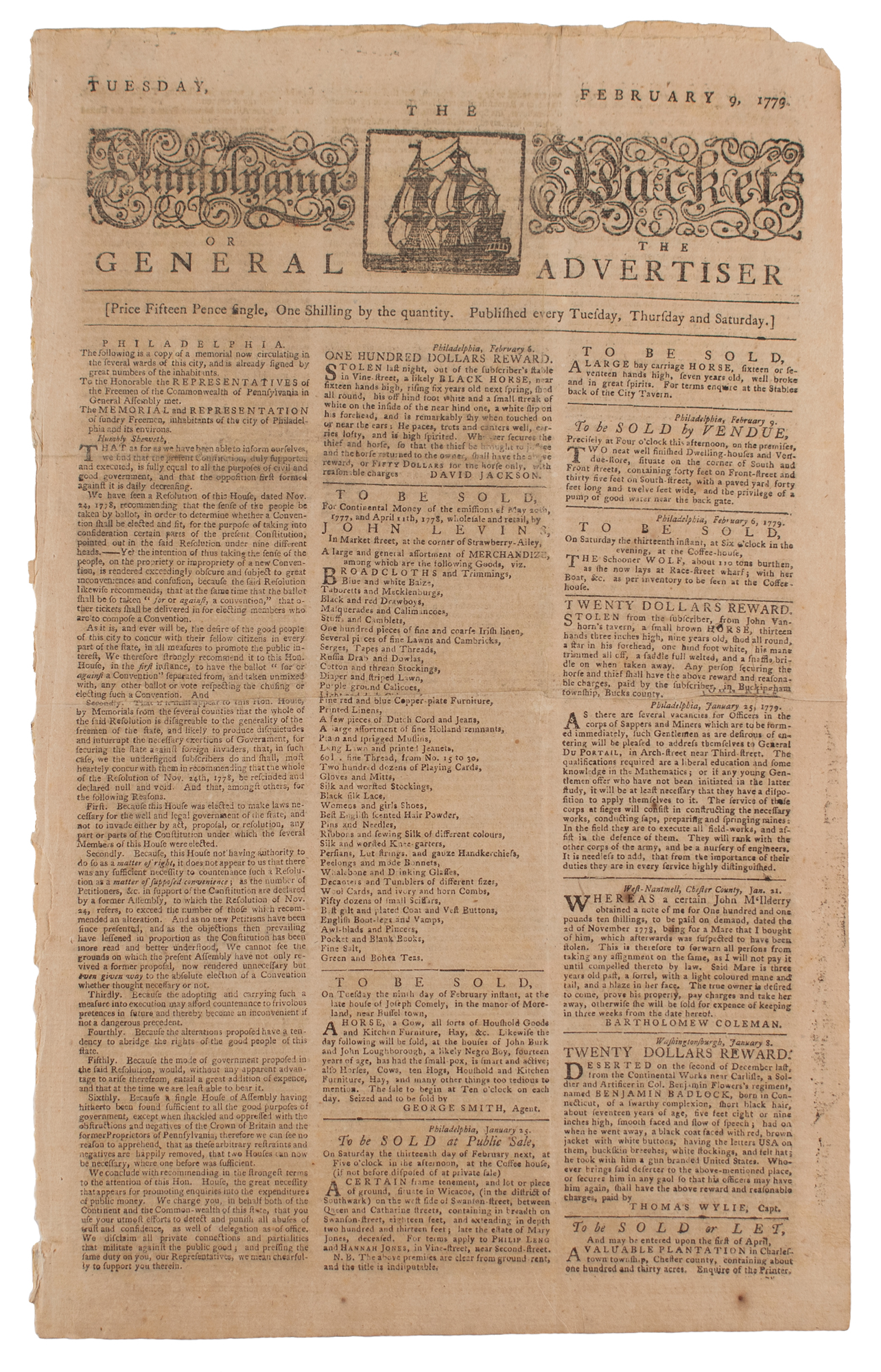 The Pennsylvania Packet or the General Advertiser, February 9, 1779; printed and sold by John Dunlap. Text of memorial circulating in Philadelphia objecting to House resolution concerning referendum to determine whether to amend the constitution. Report from London: "Orders are sent by the government to the Earl of Buckinghamshire, Lord Lieutenant of Ireland, for raining 12,000 land forces in that kingdom as speedily as possible, who are, when ready, to go to America, with 13,000 more to be sent from England the latter end of February or the beginning of March."