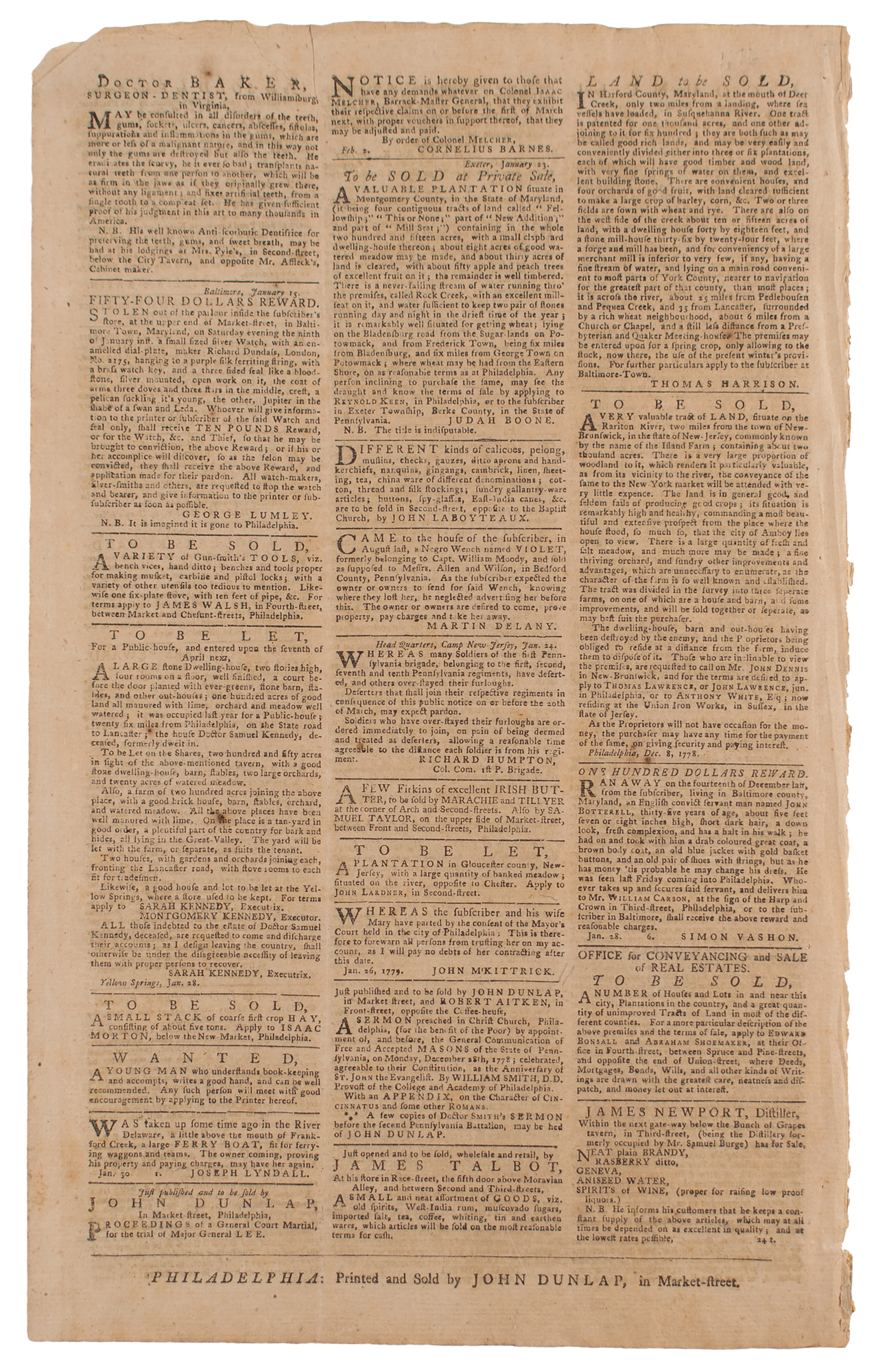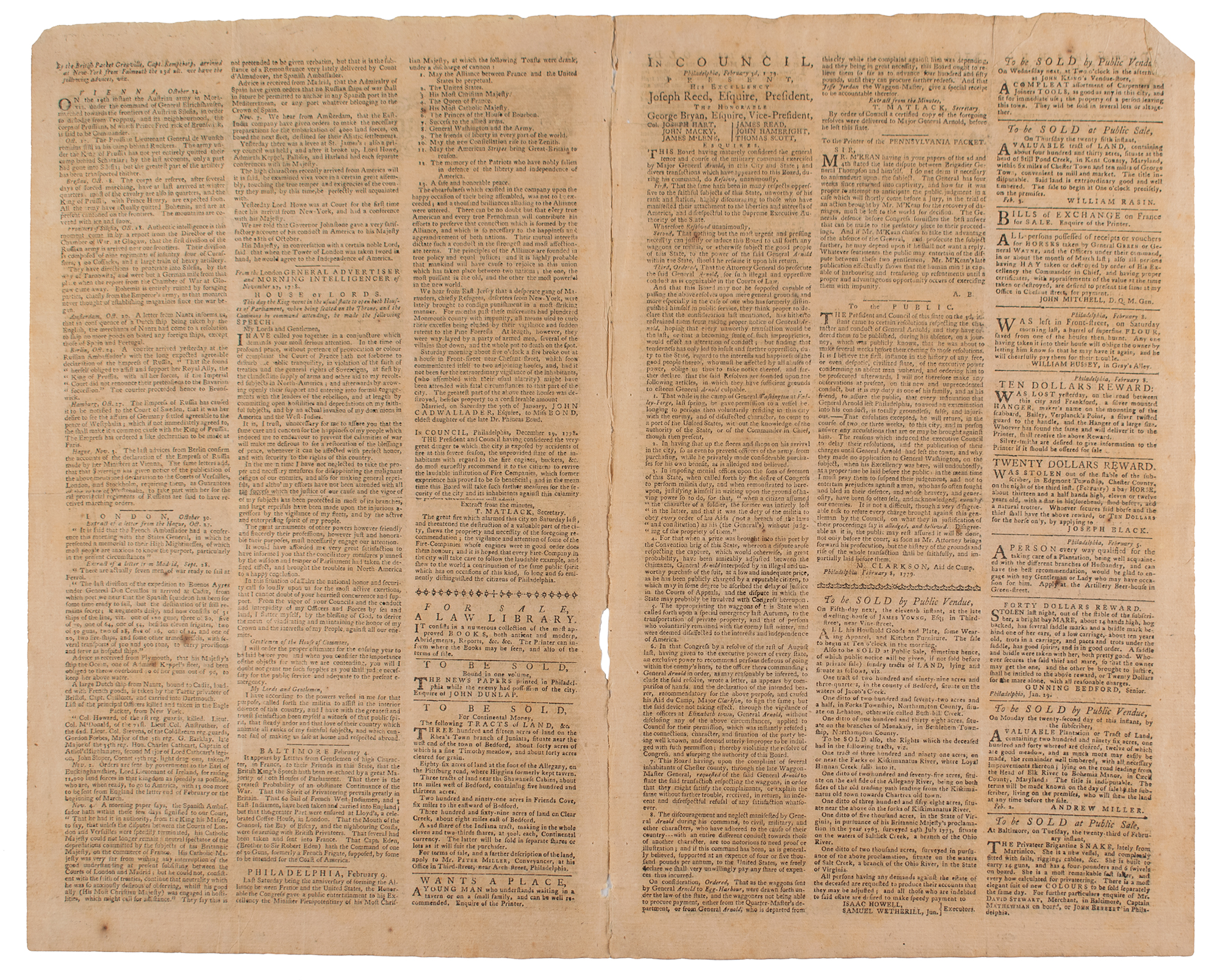 Full text, with bold headline: "IN COUNCIL, Philadelphia, February 3, 1779, resolution condemning the conduct of General Arnold in his military command in Philadelphia and Pennsylvania; full text of reply of Arnold’s Aide de Camp, Matthew Clarkson. Back page advertisement for Doctor Baker, Surgeon - Dentist, from Williamsburg, Virginia; Dr. Baker "may be had at his lodgings at Mrs. Pyle’s, in Second-Street, below the City Tavern, and opposite Mr. Affleck’s, Cabinet-maker" in Philadelphia. [Dr. Baker was George Washington’s dentist - On 13 October 1773, Washington noted in his diary that "Mr. Baker Surgeon Dentist" had arrived at Mount Vernon that afternoon. The dentist stayed several days and charged £5, according to the planter’s accounts.]