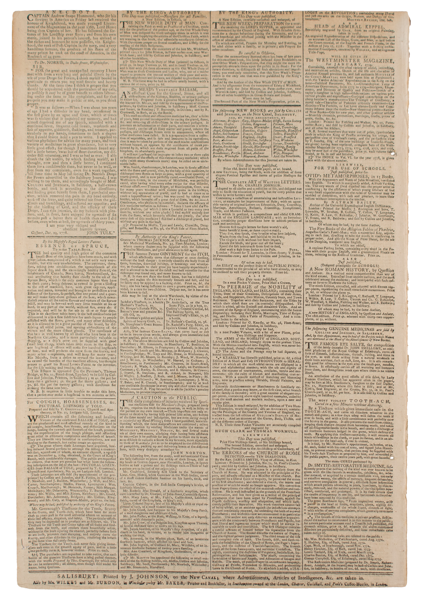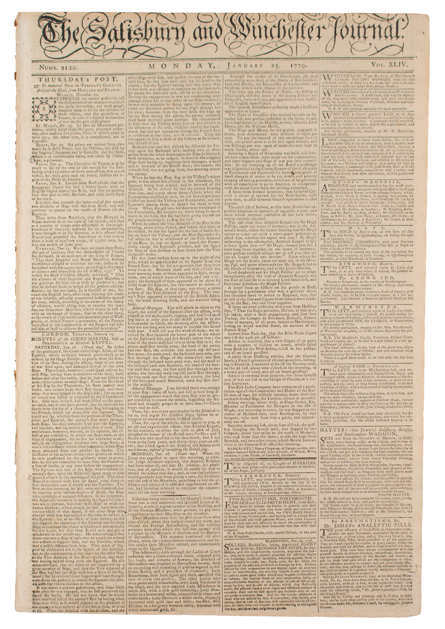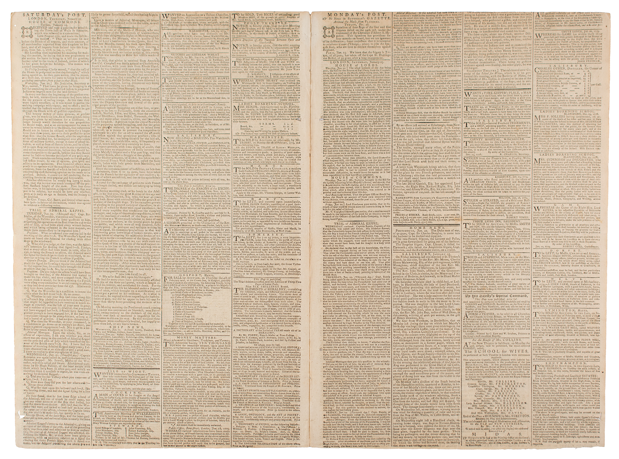 The Salisbury and Winchester Journal, January 25, 1779, printed in Salisbury by J. Johnson. "Col. Campbell was safely arrived at Charlestown, South Carolina, with 2000 men from Rhode Island, where he was received with open arms by the people in general, who were heartily tired of the Congress." "[A] number of people in Virginia, Carolina, and the Jersies, had been disarmed by order of the Congress, having discovered very strong symptoms of inclining to a revolt." Announcement of the death of David Garrick, Esq., famous actor of the British stage.