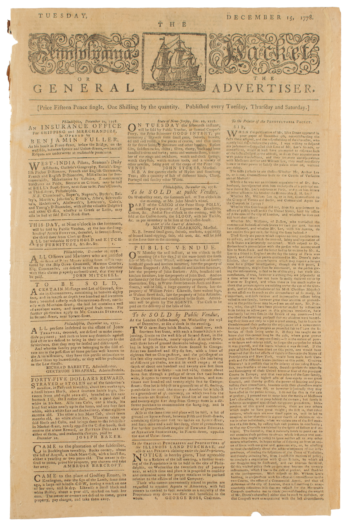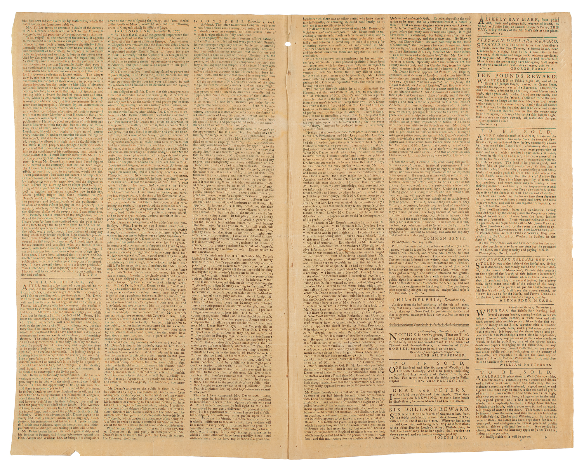 The Pennsylvania Packet or the General Advertiser, December 15, 1778; printed and sold by John Dunlap. Extensive discussions about Silas Deane and his activities in Europe, including a lengthy letter from "Common Sense" [Thomas Paine]; resolutions in Congress in December 1778 set forth discussing need for consultation on foreign affairs. Report from Philadelphia that "thirty thousand tons of shipping had been suddenly taken up in New-York for government service, and that a general embargo is laid; the occasion has not yet transpired."