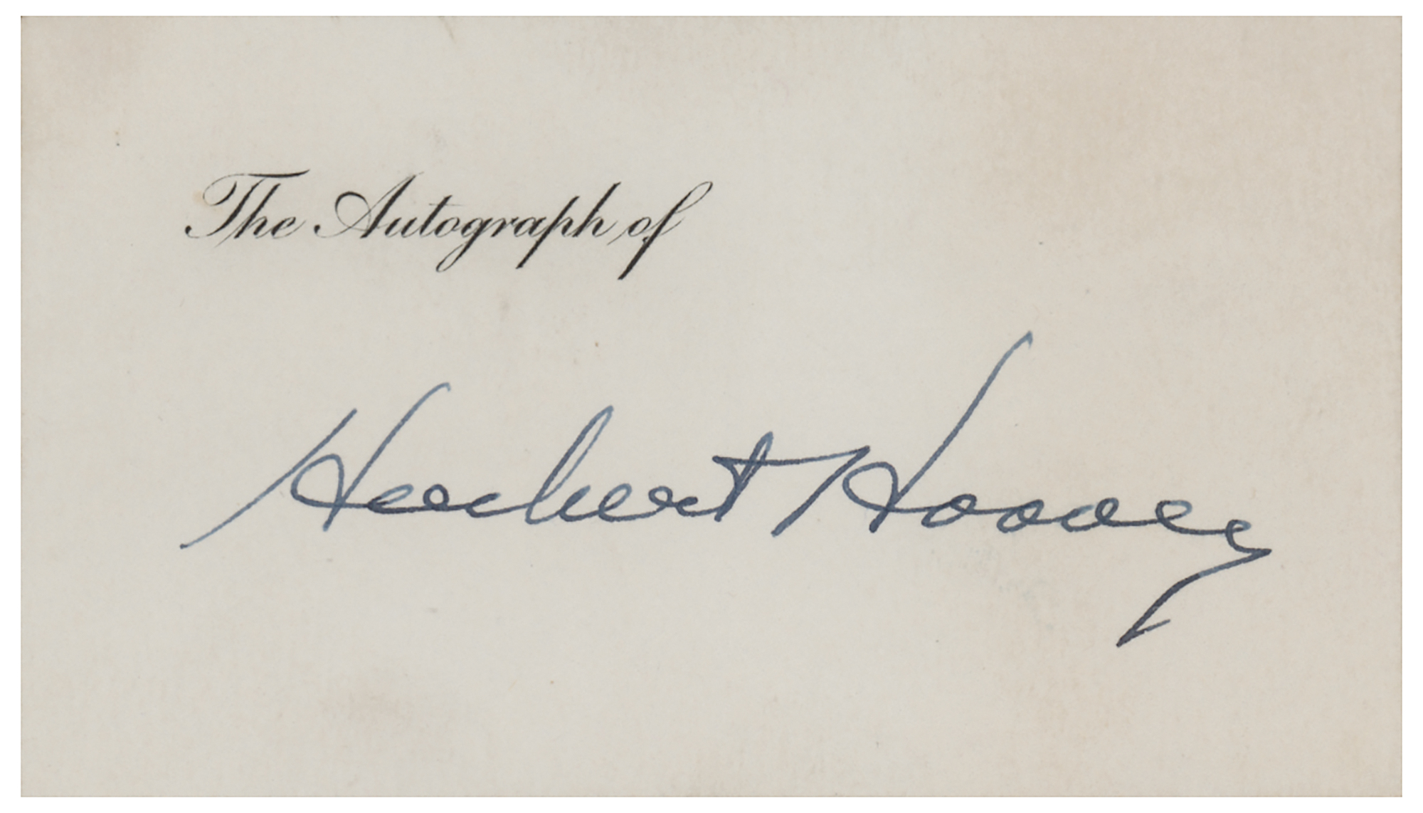Fountain pen signature, "Herbert Hoover,” on an off-white 3.5 x 2 card. In fine condition. Accompanied by an unsigned copy of 'Little Blue Book No. 1612: Herbert Hoover's Records Before He Became President.'